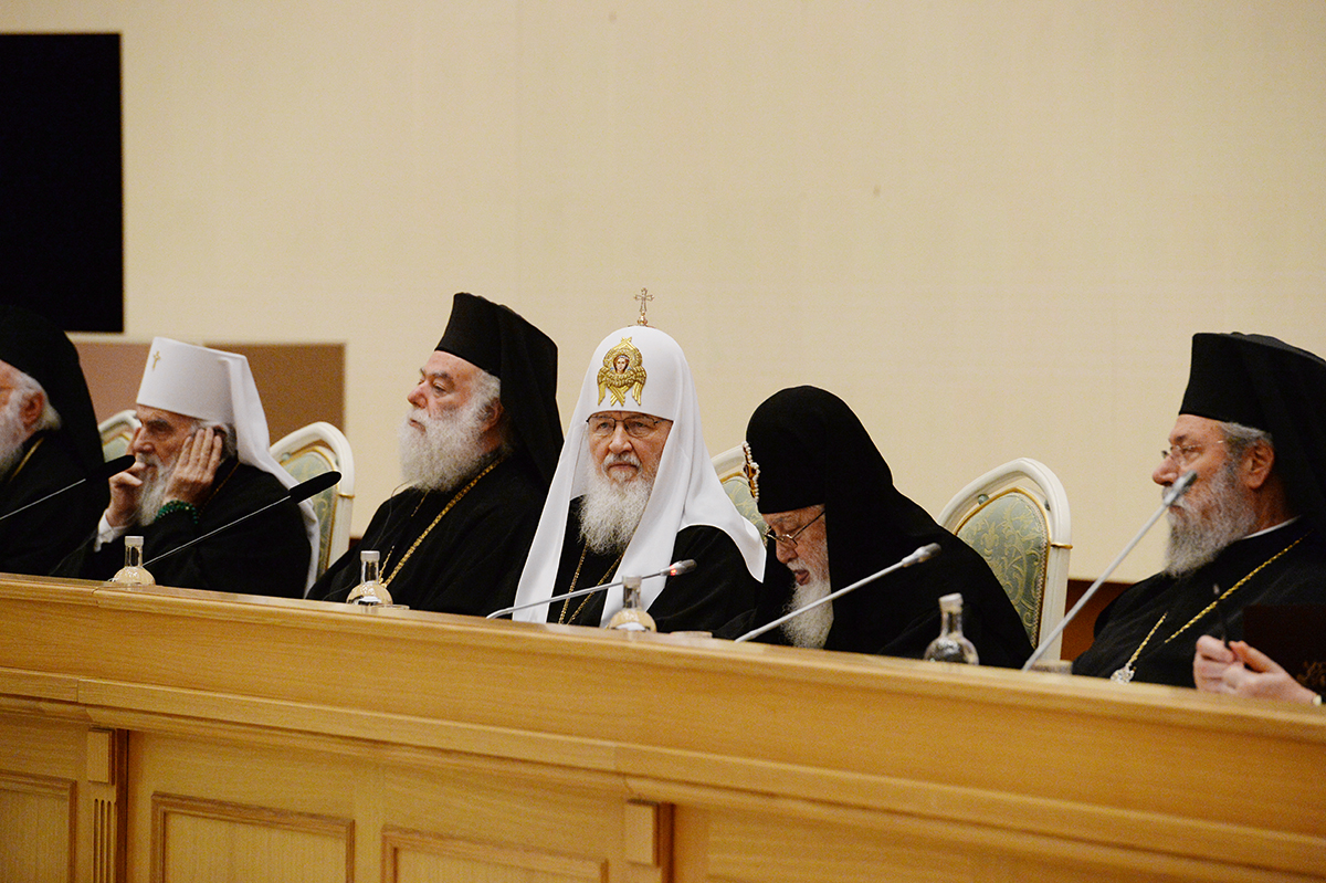 Вместе со Святейшим Патриархом Кириллом в президиуме заседания в Зале церковных соборов присутствовали Предстоятели и представители Поместных Православных Церквей: Блаженнейший Папа и Патриарх Александрийский и всей Африки Феодор II; Святейший и Блаженнейший Католикос-Патриарх всея Грузии Илия II; Святейший Патриарх Сербский, Архиепископ Печский, Митрополит Белградо-Карловацкий Ириней; Блаженнейший Архиепископ Новой Юстинианы и всего Кипра Хризостом II; Блаженнейший Архиепископ Тиранский и всей Албании Анастасий; Блаженнейший Митрополит Варшавский и всей Польши Савва; Блаженнейший Митрополит Чешских земель и Словакии Ростислав; Блаженнейший Архиепископ Вашингтонский, Митрополит всей Америки и Канады Тихон; а также представители делегаций Поместных Церквей: митрополит Филиппопольский Нифон (Антиохийский Патриархат), митрополит Вострский Тимофей (Иерусалимский Патриархат); митрополит Тырговиштский Нифон, (Румынский Патриархат); митрополит Западно- и Среднеевропейский Антоний (Болгарский Патриархат); митрополит Димитриадский Игнатий (Элладская Православная Церковь). В числе присутствовавших в президиуме были Блаженнейший митрополит Киевский и всея Украины Онуфрий, митрополит Крутицкий и Коломенский Ювеналий.