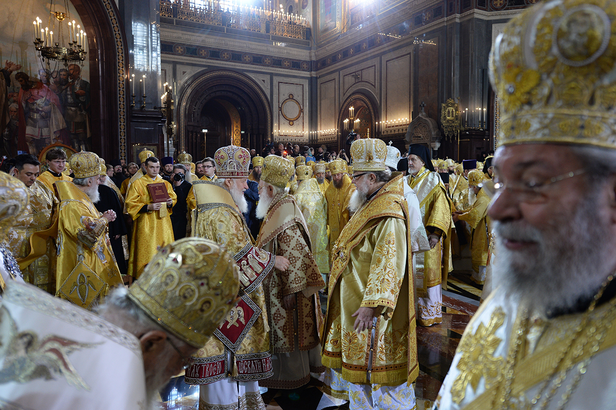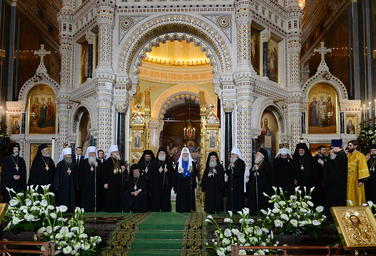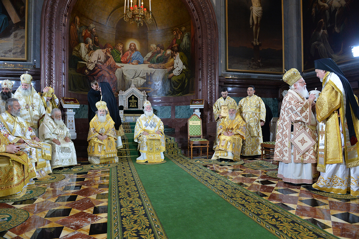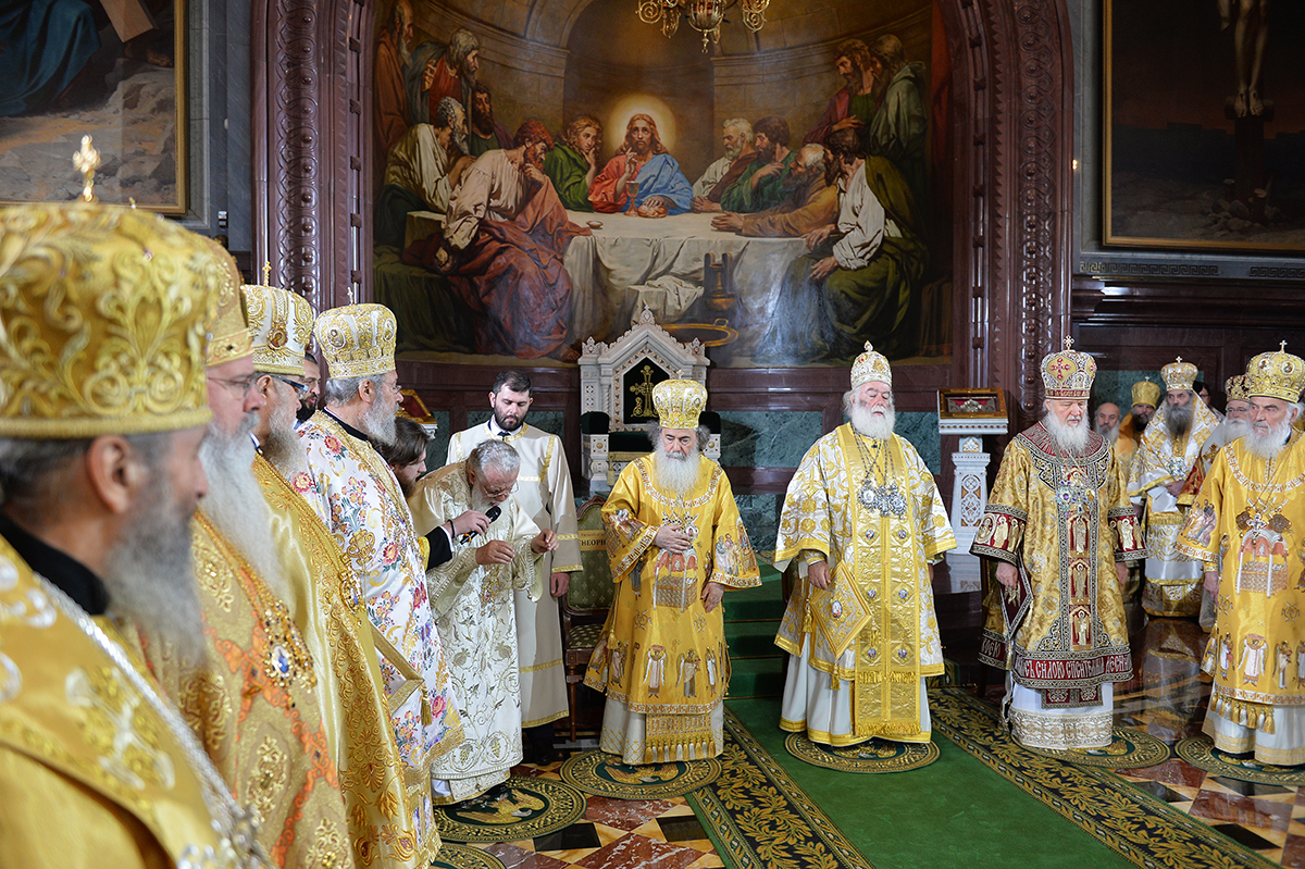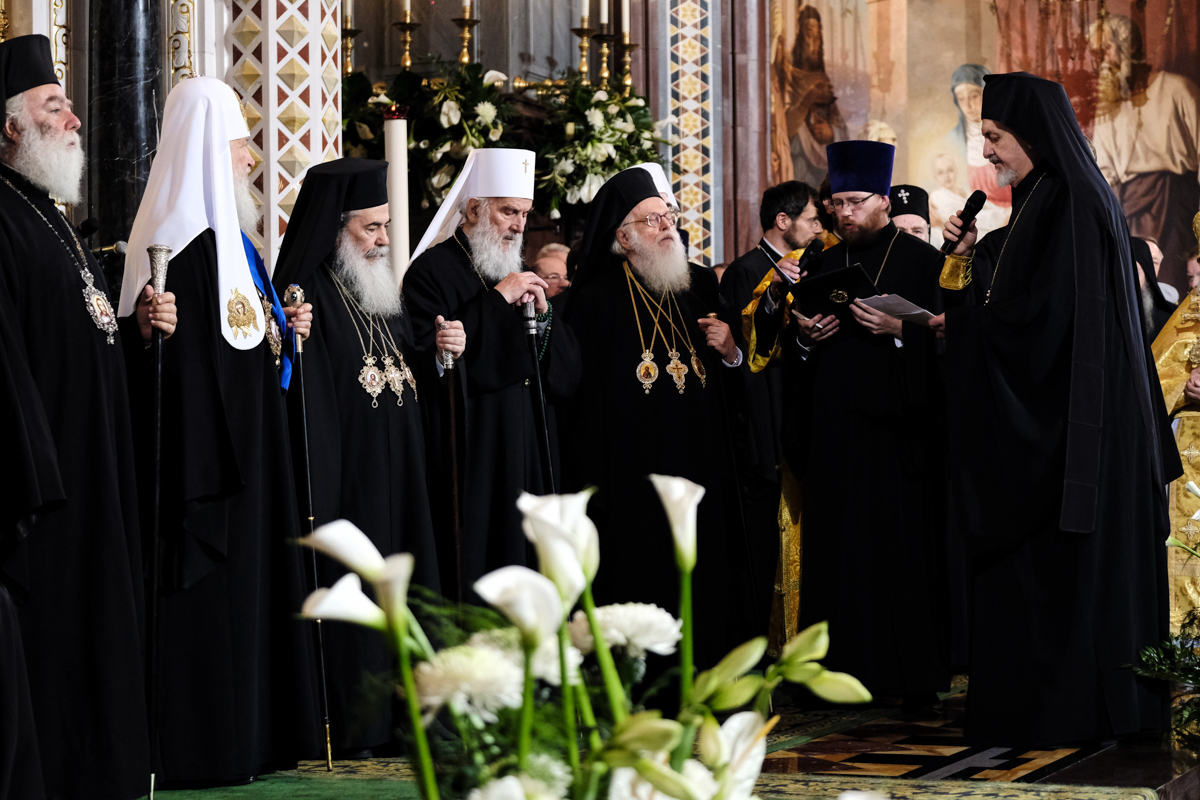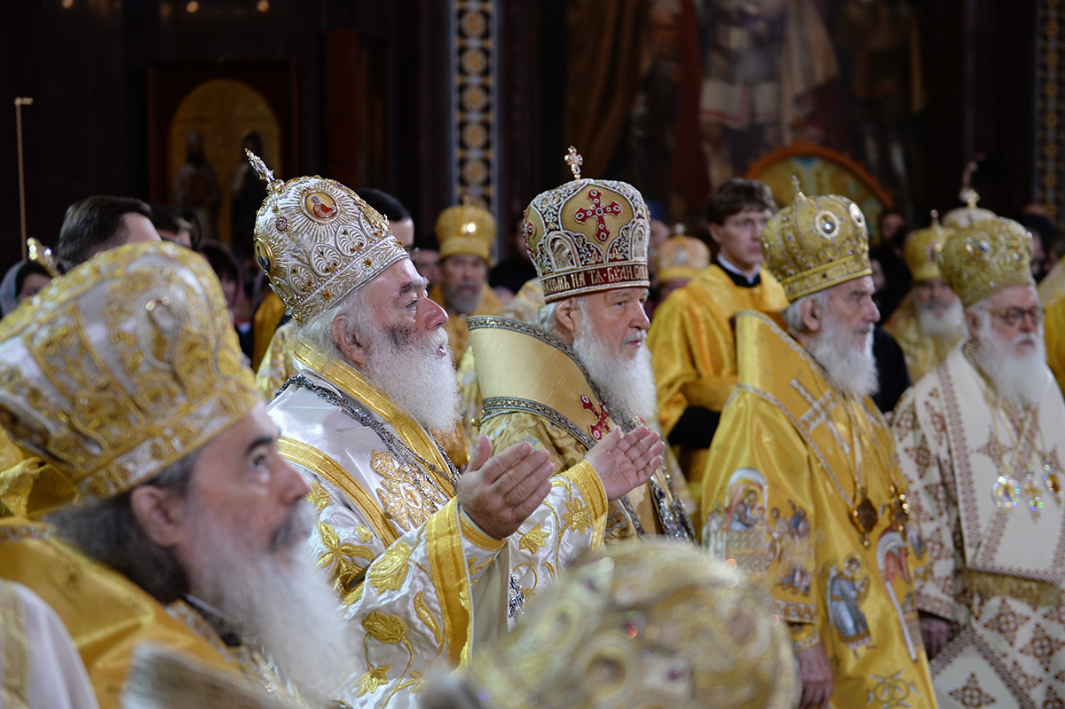 Богослужение возглавили: Блаженнейший Папа и Патриарх Александрийский и всей Африки Феодор II, Блаженнейший Патриарх Святого Града Иерусалима и всей Палестины Феофил III, Святейший Патриарх Московский и всея Руси Кирилл, Святейший и Блаженнейший Католикос-Патриарх всея Грузии Илия II, Святейший Патриарх Сербский, Архиепископ Печский, Митрополит Белградо-Карловацкий Ириней, Блаженнейший Архиепископ Новой Юстинианы и всего Кипра Хризостом II, Блаженнейший Архиепископ Тиранский и всей Албании Анастасий, Блаженнейший Митрополит Варшавский и всей Польши Савва, Блаженнейший Митрополит Чешских земель и Словакии Ростислав, Блаженнейший Архиепископ Вашингтонский, Митрополит всей Америки и Канады Тихон.