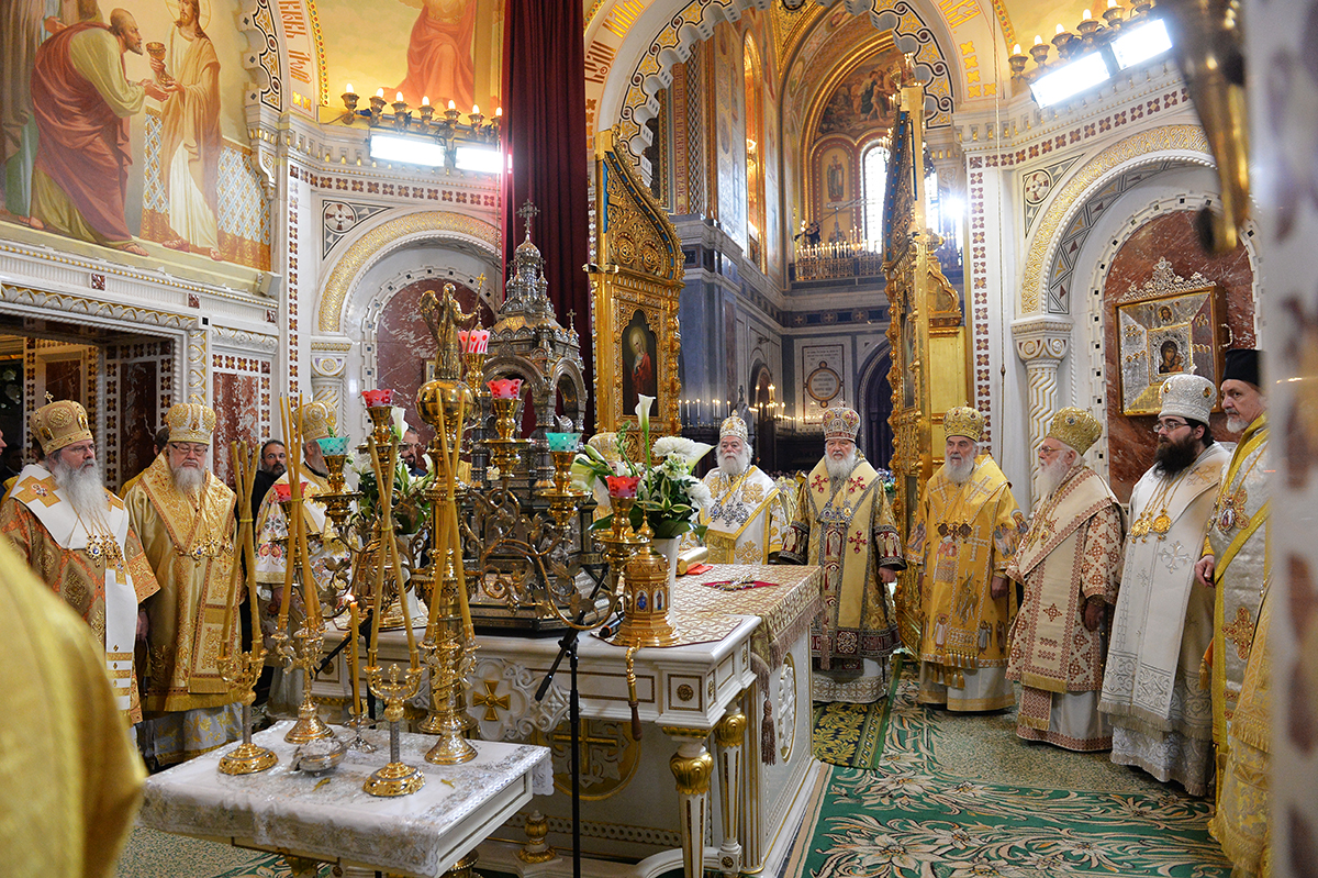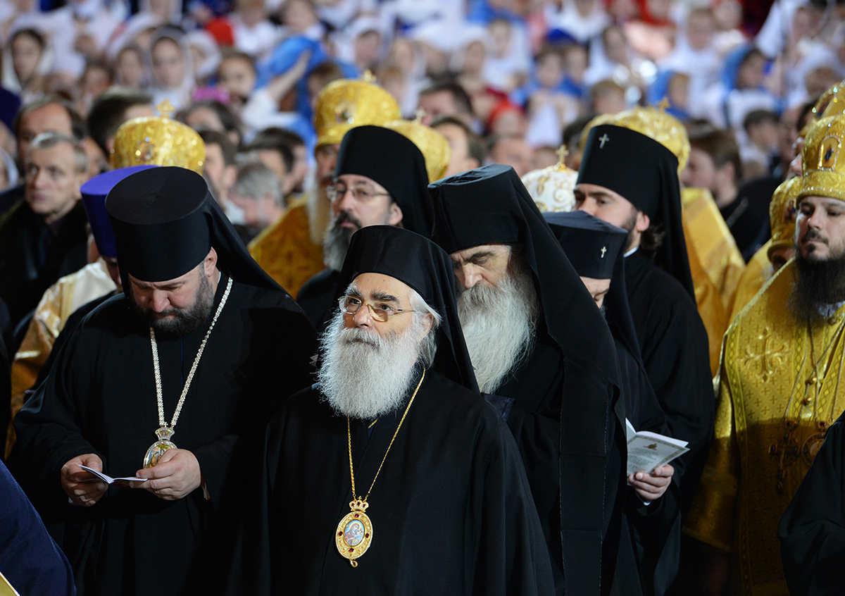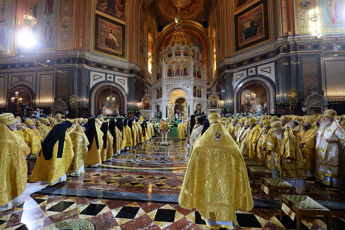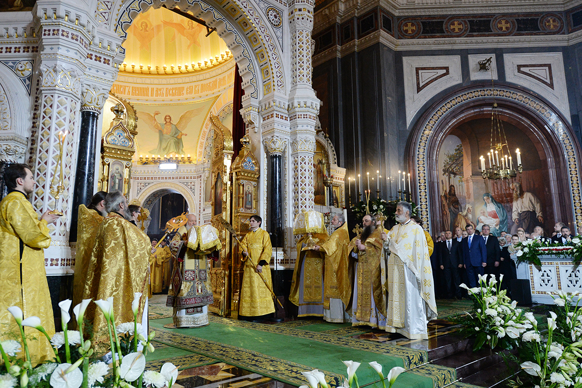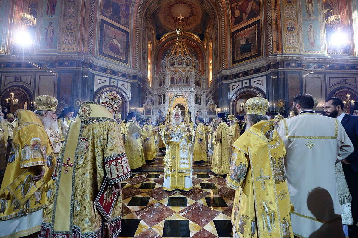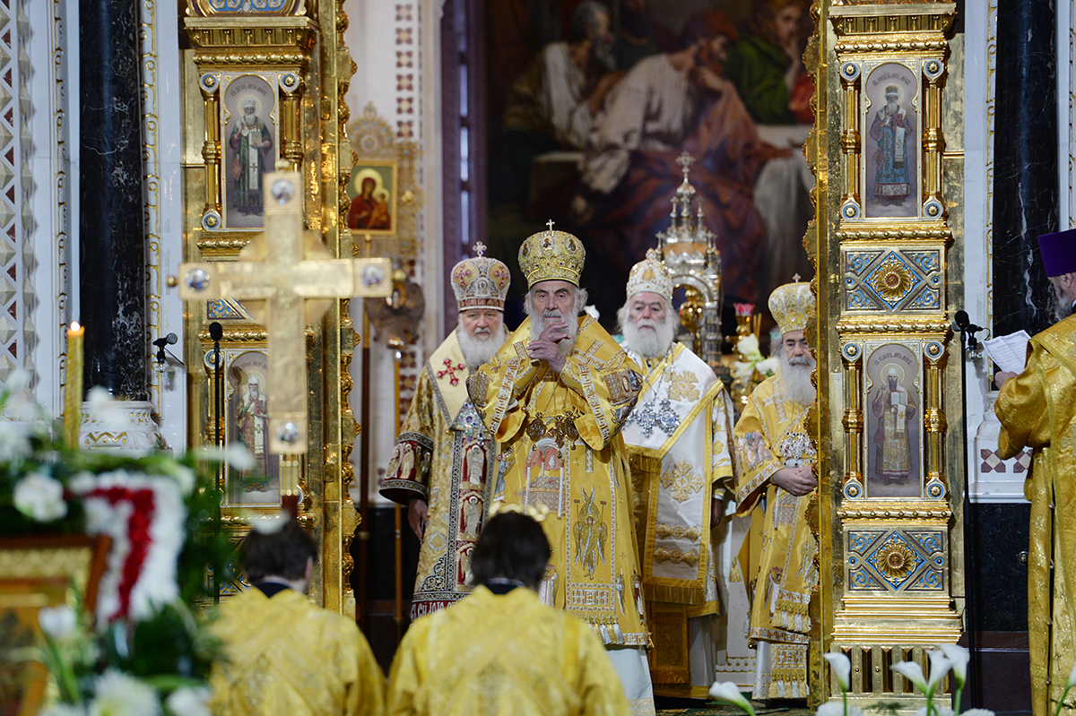 Богослужение возглавили: Блаженнейший Папа и Патриарх Александрийский и всей Африки Феодор II, Блаженнейший Патриарх Святого Града Иерусалима и всей Палестины Феофил III, Святейший Патриарх Московский и всея Руси Кирилл, Святейший и Блаженнейший Католикос-Патриарх всея Грузии Илия II, Святейший Патриарх Сербский, Архиепископ Печский, Митрополит Белградо-Карловацкий Ириней, Блаженнейший Архиепископ Новой Юстинианы и всего Кипра Хризостом II, Блаженнейший Архиепископ Тиранский и всей Албании Анастасий, Блаженнейший Митрополит Варшавский и всей Польши Савва, Блаженнейший Митрополит Чешских земель и Словакии Ростислав, Блаженнейший Архиепископ Вашингтонский, Митрополит всей Америки и Канады Тихон.