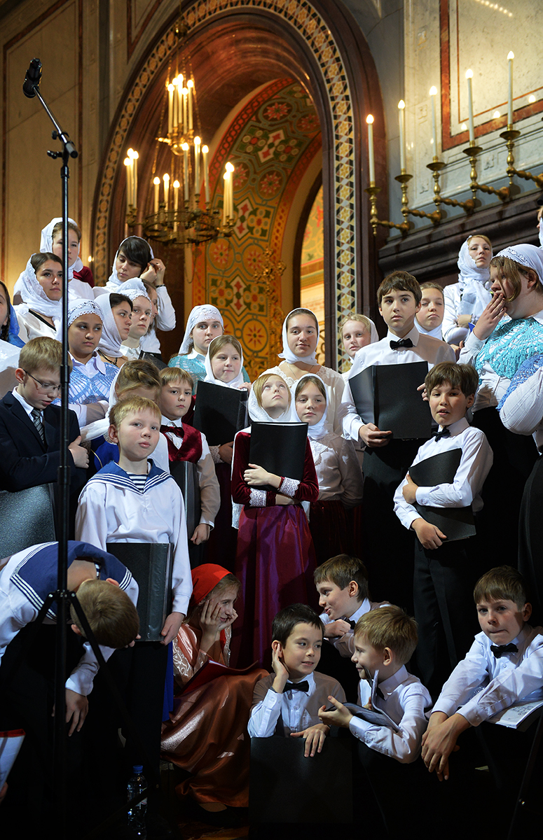 За Литургией пели: Патриарший хор Храма Христа Спасителя, регент И.Б. Толкачев; братский хор Свято-Троицкой Сергиевой лавры, регент архимандрит Глеб (Кожевников); сводный детский хор воскресных и церковных музыкальных школ Москвы и Подмосковья под управлением Варвары Волковой.