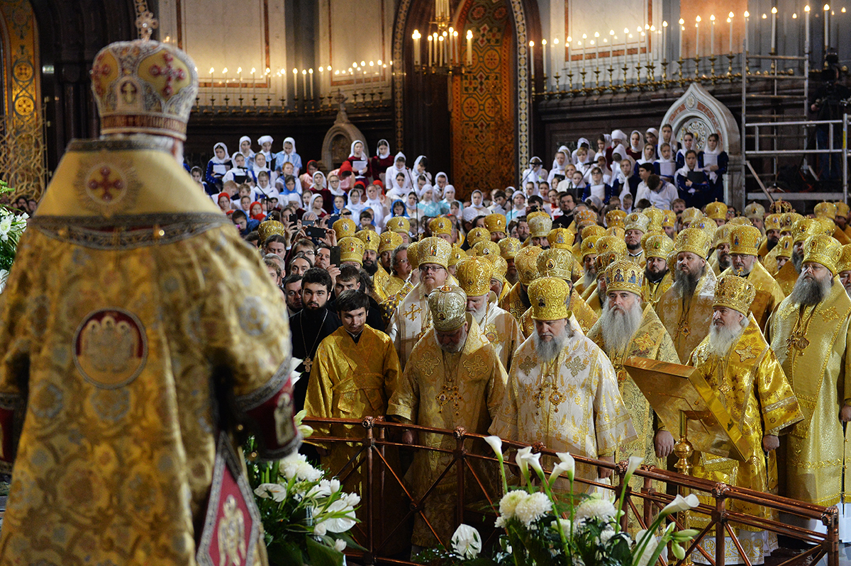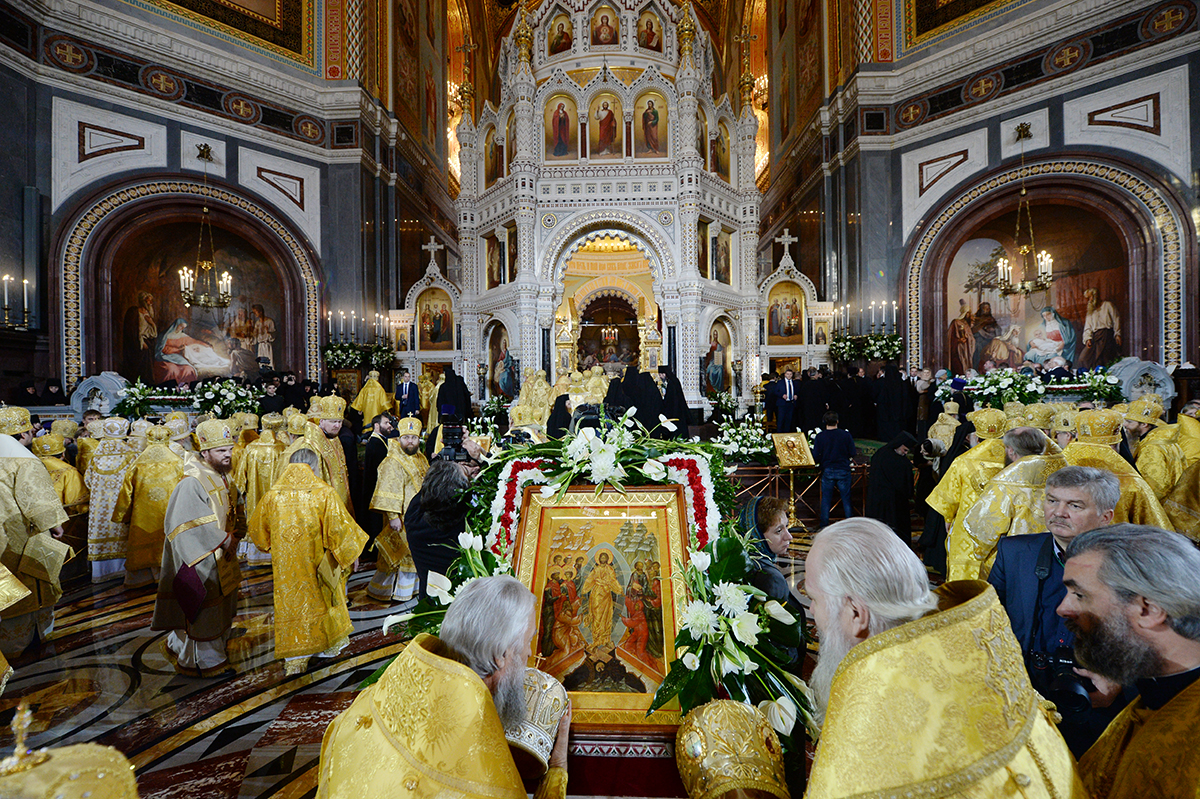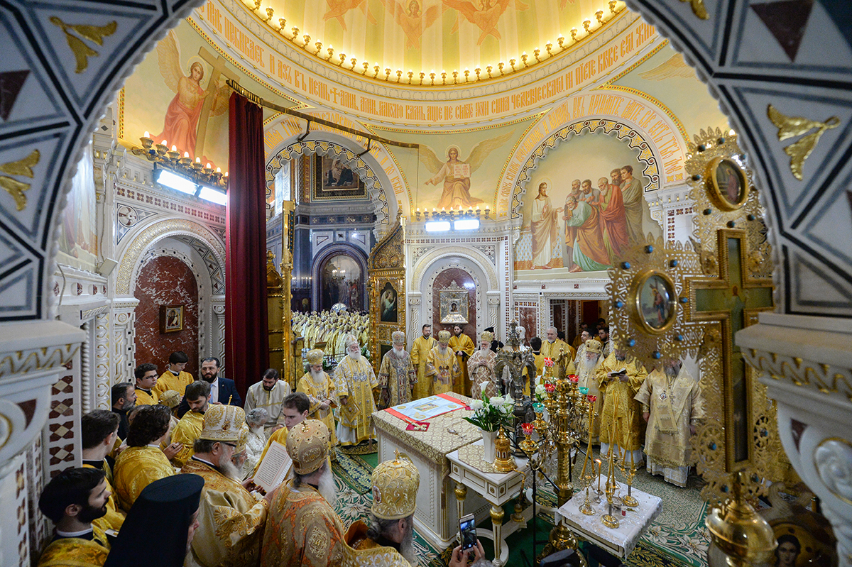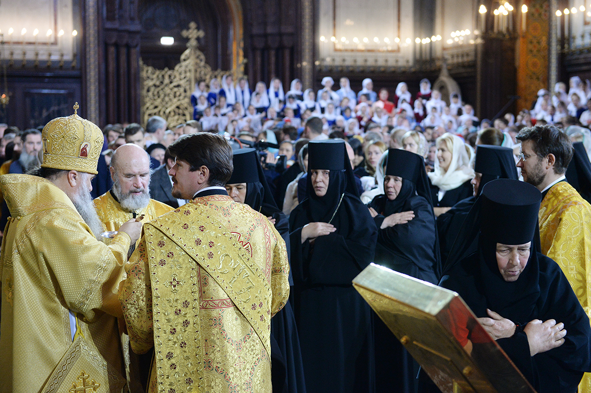 В Храме Христа Спасителя молились председатель Синодального отдела по взаимоотношениям Церкви с обществом и СМИ В.Р. Легойда, игумены и игумении монастырей, сотрудники синодальных учреждений, представители православных молодежных организаций, многочисленные верующие.