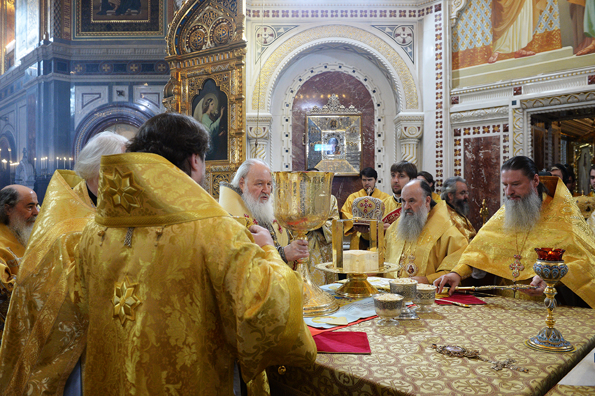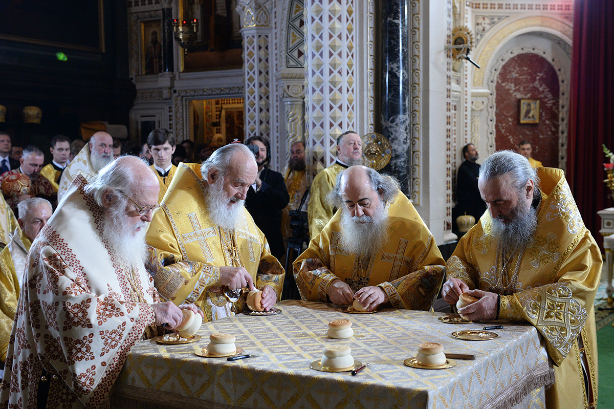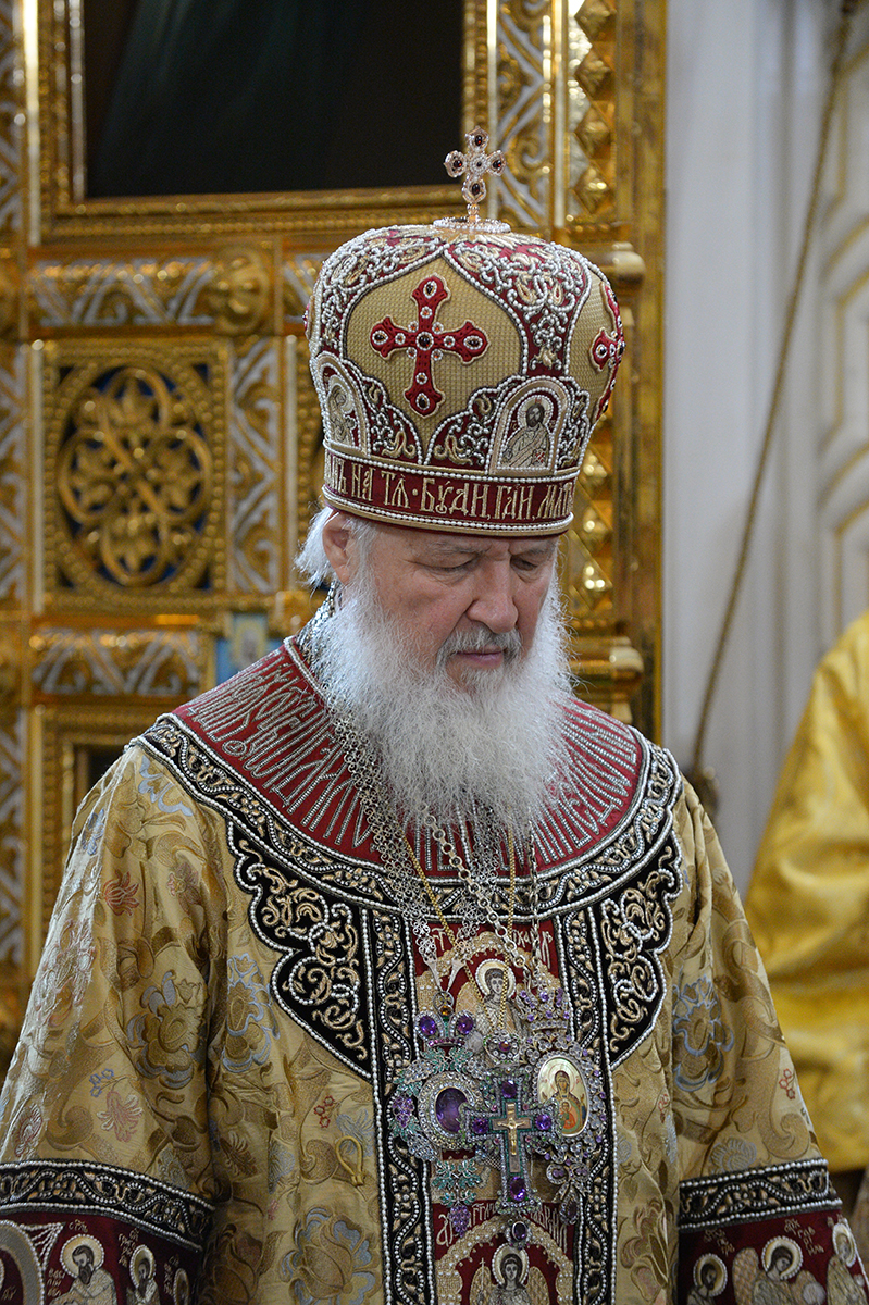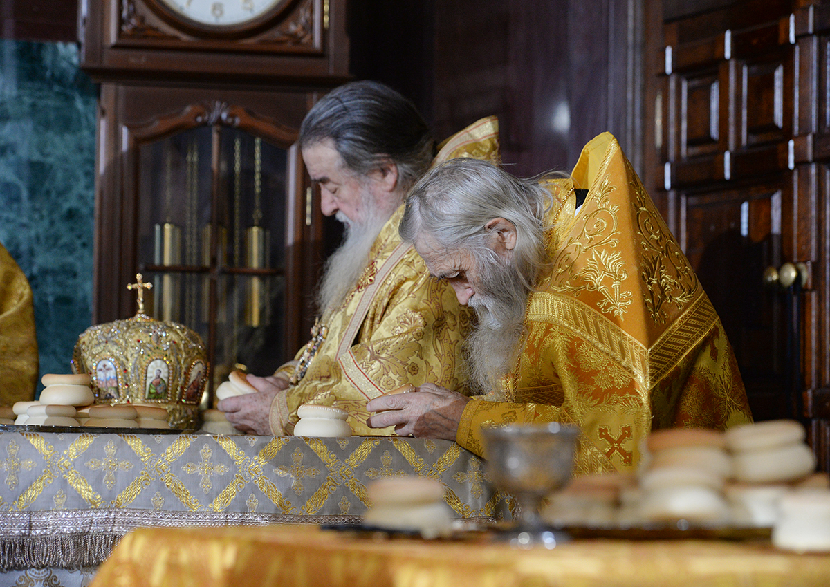 После сугубой ектении Святейший Патриарх Кирилл вознес молитвы о мире на Украине. Блаженнейший митрополит Киевский и всея Украины Онуфрий прочитал молитву о Святейшем Патриархе Кирилле.