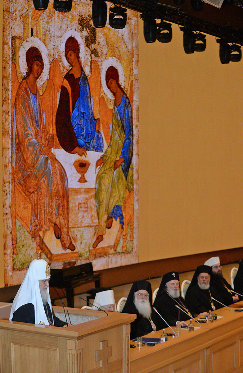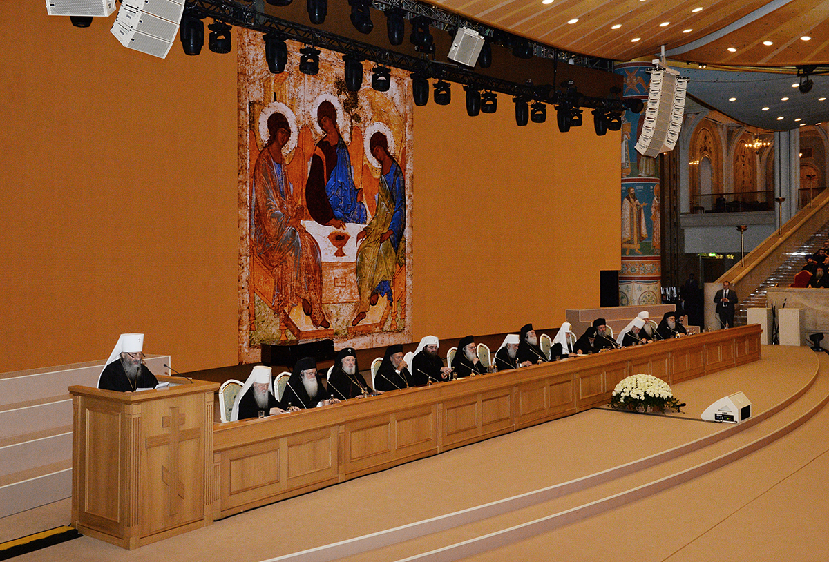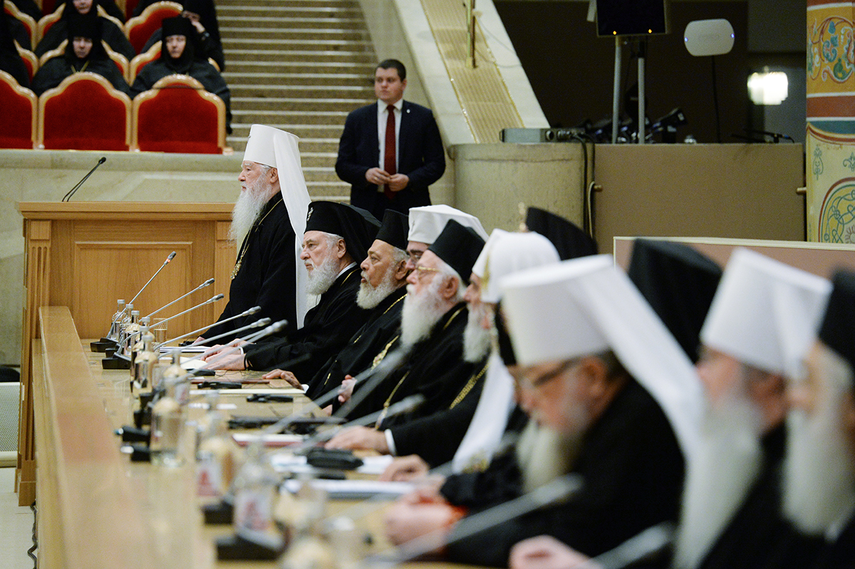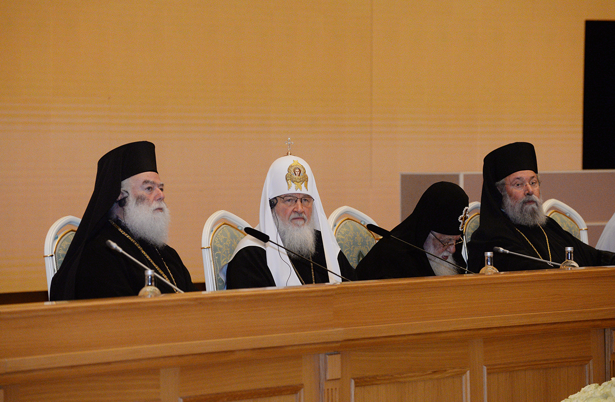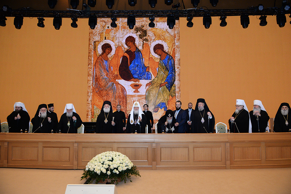 Вместе со Святейшим Патриархом Кириллом в президиуме заседания в Зале церковных соборов присутствовали Предстоятели и представители Поместных Православных Церквей: Блаженнейший Папа и Патриарх Александрийский и всей Африки Феодор II; Святейший и Блаженнейший Католикос-Патриарх всея Грузии Илия II; Святейший Патриарх Сербский, Архиепископ Печский, Митрополит Белградо-Карловацкий Ириней; Блаженнейший Архиепископ Новой Юстинианы и всего Кипра Хризостом II; Блаженнейший Архиепископ Тиранский и всей Албании Анастасий; Блаженнейший Митрополит Варшавский и всей Польши Савва; Блаженнейший Митрополит Чешских земель и Словакии Ростислав; Блаженнейший Архиепископ Вашингтонский, Митрополит всей Америки и Канады Тихон; а также представители делегаций Поместных Церквей: митрополит Филиппопольский Нифон (Антиохийский Патриархат), митрополит Вострский Тимофей (Иерусалимский Патриархат); митрополит Тырговиштский Нифон, (Румынский Патриархат); митрополит Западно- и Среднеевропейский Антоний (Болгарский Патриархат); митрополит Димитриадский Игнатий (Элладская Православная Церковь). В числе присутствовавших в президиуме были Блаженнейший митрополит Киевский и всея Украины Онуфрий, митрополит Крутицкий и Коломенский Ювеналий.