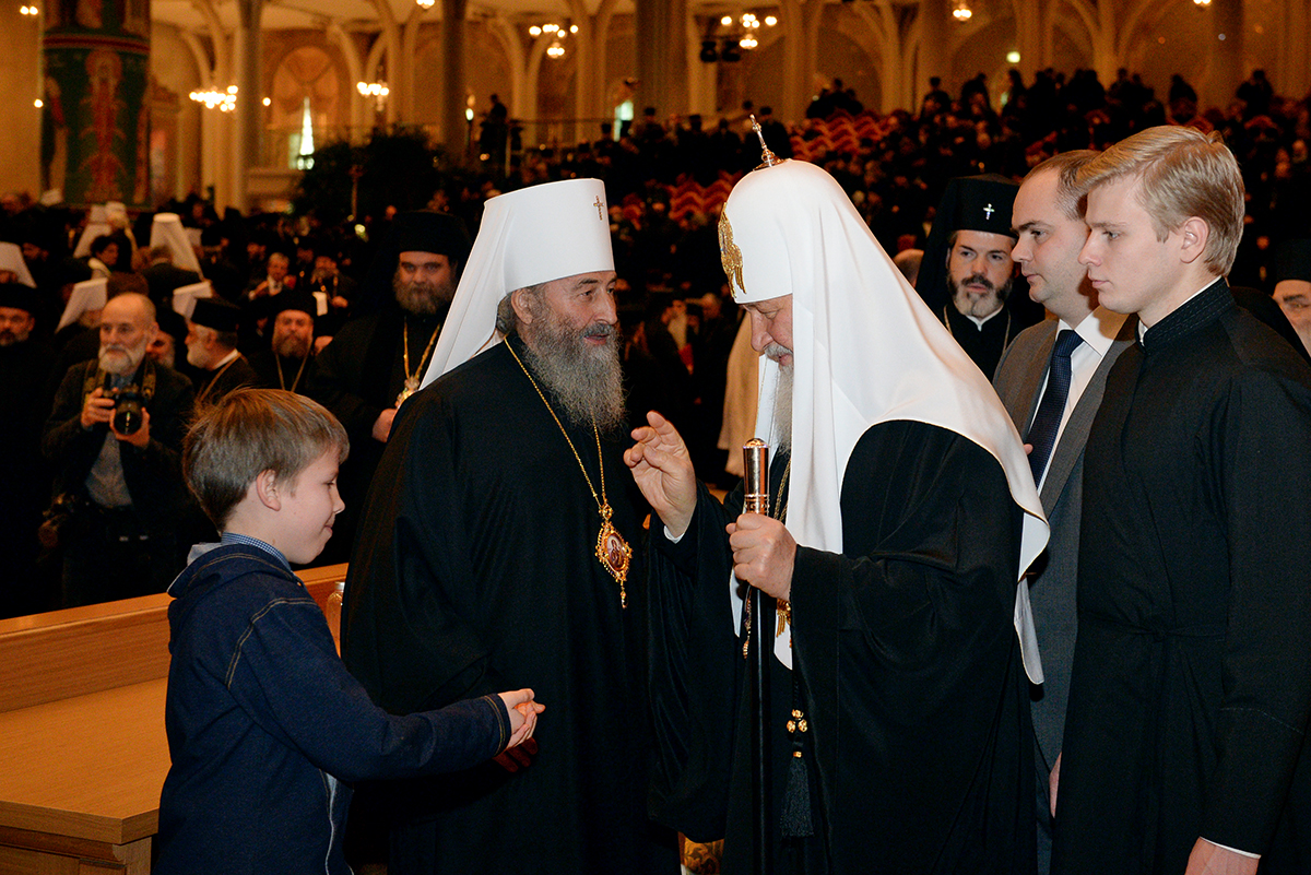 От лица Постоянных членов Священного Синода и всего епископата Русской Православной Церкви, а также от имени православных верующих Украины со словами поздравления к Святейшему Патриарху Кириллу обратился Блаженнейший митрополит Киевский и всея Украины Онуфрий. Блаженнейший Владыка, в частности, сказал: «Сегодня великий день для всей полноты Русской Православной Церкви. Сегодня мы празднуем знаменательный юбилей 70-летия нашего Святейшего Патриарха, Предстоятеля Русской Православной Церкви, светильник для которой некогда возжег в древнем Киеве святой равноапостольный великий князь Владимир, и ветви которой распространились на все княжества необъятной Руси. Сегодня Русская Православная Церковь обнимает любовью во Христе и пастырской заботой не только Русь, но и иные народы, имеющие отношение к Владимирову крещению, и во главе этой огромной Церкви Господь поставил Вас, Ваше Святейшество. Это тяжелый крест, который Вы несете с высоким достоинством. Мы радуемся, имея Первосвященника, который разделяет с нами наши скорби и участливо молится за всех нас. Мы просим Бога, чтобы светильник Вашего Патриаршего служения еще много лет возжигал сердца человеческие огнем Божественной любви и ревности по хранению чистоты Православной веры».