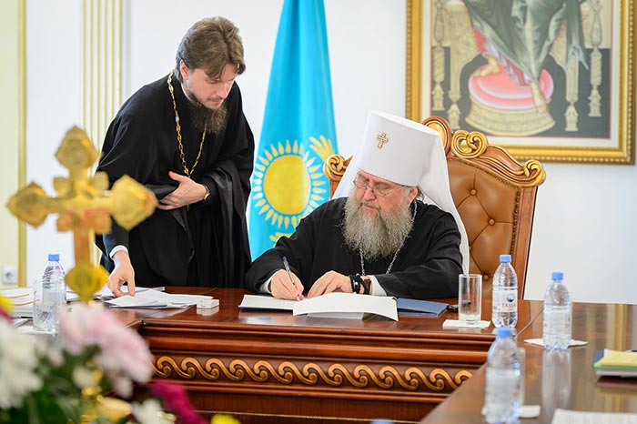 Митрополит Александр представил на Синоде доклад о встрече Святейшего Патриарха Московского и всея Руси Кирилла с министром по делам религий и гражданского общества Казахстана Н.Б. Ермекбаевым, в ходе которой обсуждались положения проекта Закона Республики «О внесении изменений и дополнений в некоторые законодательные акты Республики Казахстан по вопросам религиозной деятельности и религиозных объединений». Глава Митрополичьего округа также рассказал о посещении Нурланом Байузаковичем Представительства Православной Церкви Казахстана на Патриаршем подворье при храме во имя святых мучениц Веры, Надежды, Любови и Софии города Москвы.