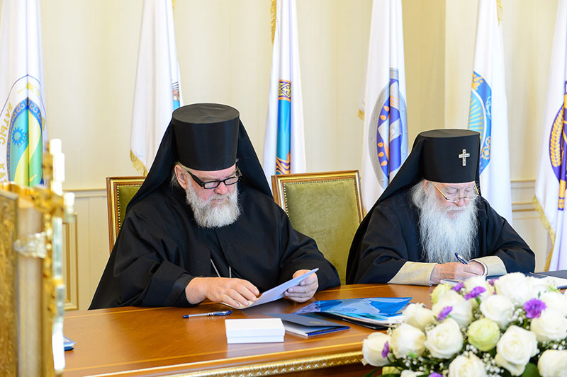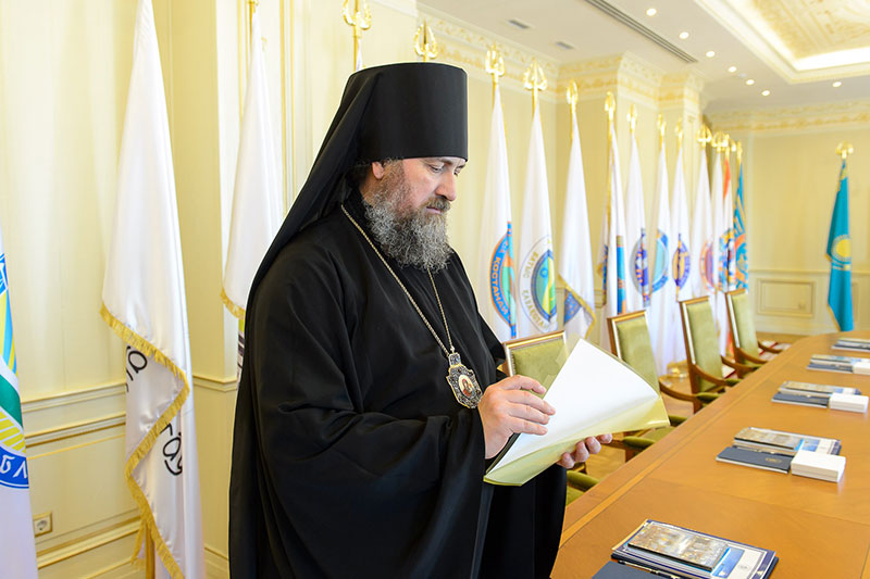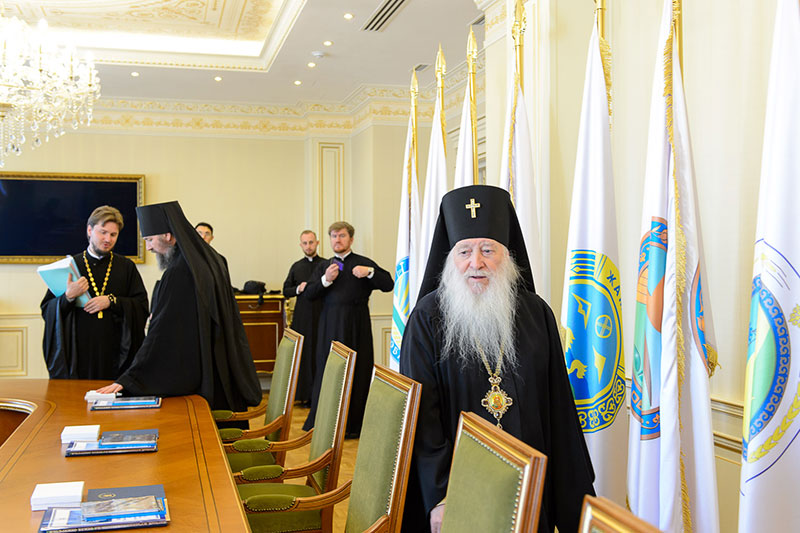 Глава Митрополичьего округа выступил с докладом об архипастырских визитах в Чимкентскую, Кокшетаускую, Карагандинскую и Уральскую епархии, в рамках которых состоялись богослужения, посещения храмов, общение с духовенством и прихожанами и прошли встречи с руководителями органов исполнительной власти регионов, и об участии в совместном заседании палат Парламента Республики Казахстан 1 сентября текущего года, на котором Президент Республики Казахстан Н.А. Назарбаев выступил с традиционным обращением к депутатам.