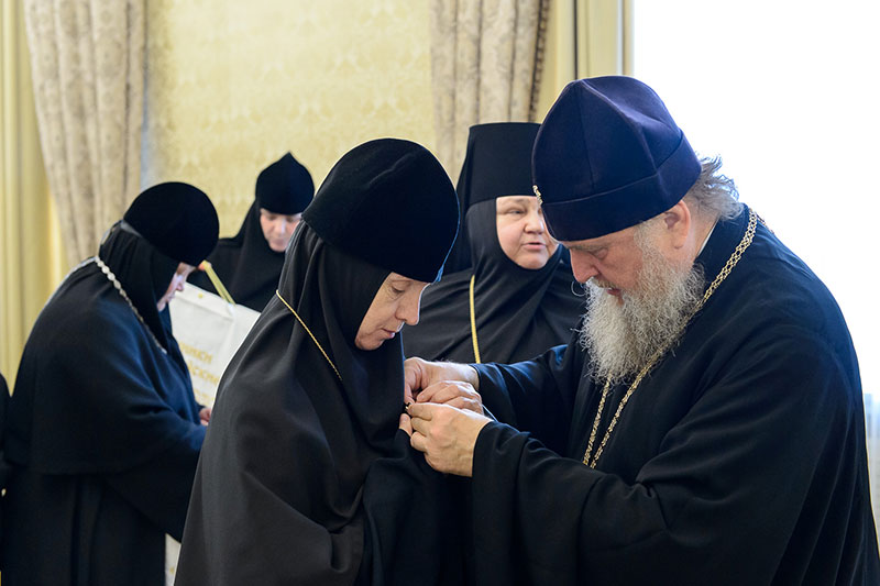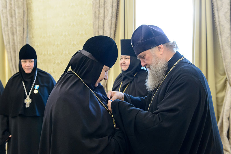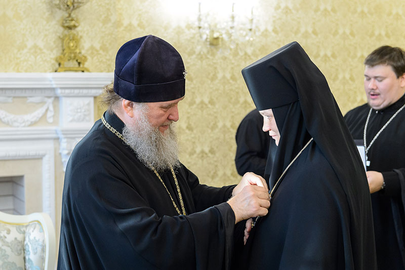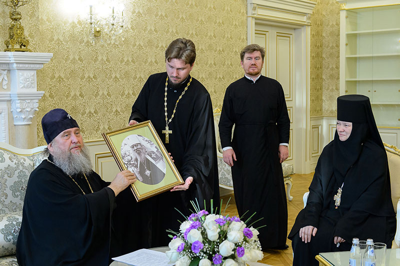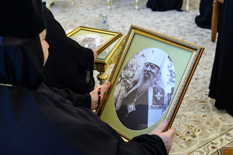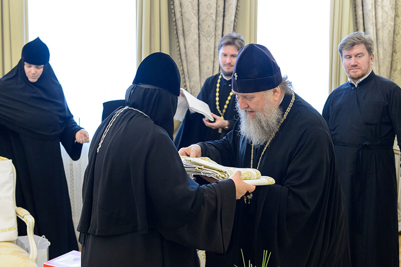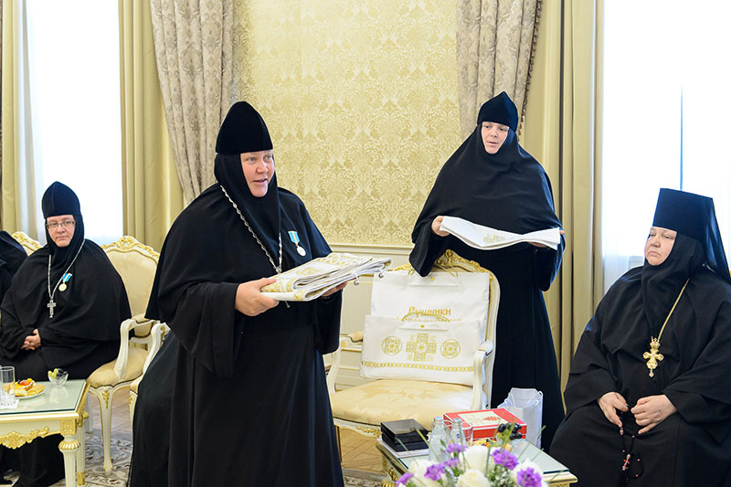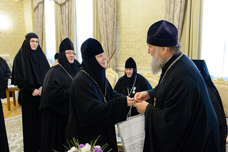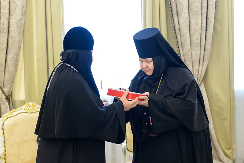 Иерарх вручил игумениям юбилейные медали «145 лет учреждения Туркестанской епархии» и подарил в благословение портреты исповедника веры и подвижника благочестия митрополита Иосифа (Чернова). Каждая участница встречи получила в подарок плакетку с изображением Софийского собора Иверско-Серафиовского монастыря, созданную специально к юбилейным датам обители, подборку изданий, рассказывающих о Православии в Казахстане, и музыкальные диски с записями Митрополичьего хора под управлением Заслуженного деятеля искусств России О.Н.Овчинникова.