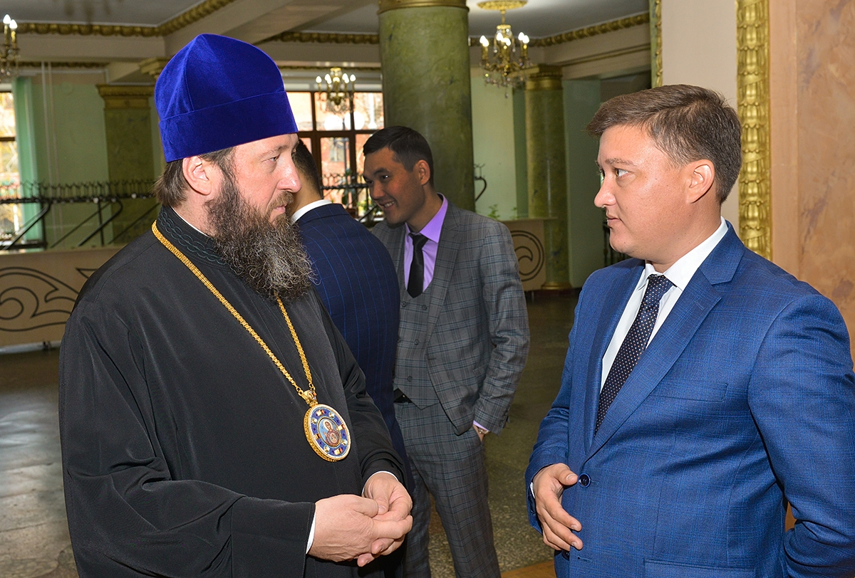 Преосвященнейший епископ Каскеленский Геннадий выступил перед собравшимися с докладом, посвященным актуальным вопросам сотрудничества религиозных конфессий в деле гармоничного развития казахстанского социума. Так же иерарх рассказал участникам праздничного мероприятия об истории Православия на территории Республики Казахстан.