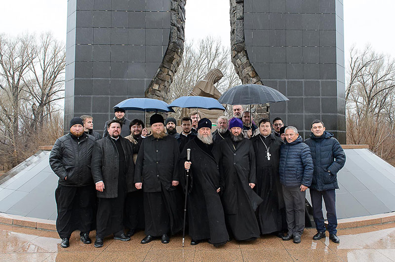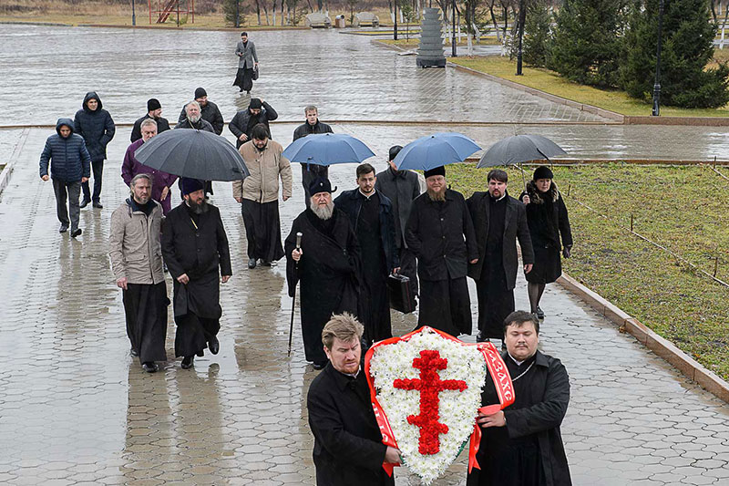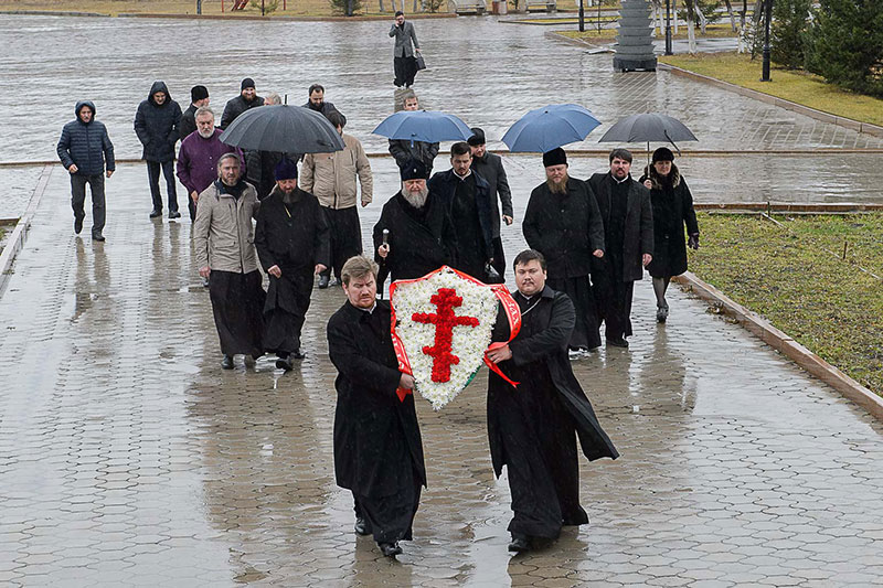 В церемонии возложения венка приняли участие: епископ Усть-Каменогорский и Семипалатинский Амфилохий, епископ Рубцовский и Алейский Роман (Алтайская митрополия Русской Православной Церкви), благочинный Семипалатинского церковного округа митрофорный протоиерей Феодор Проскурин, духовенство, прибывшее с архипастырями, клирики Усть-Каменогорской епархии.