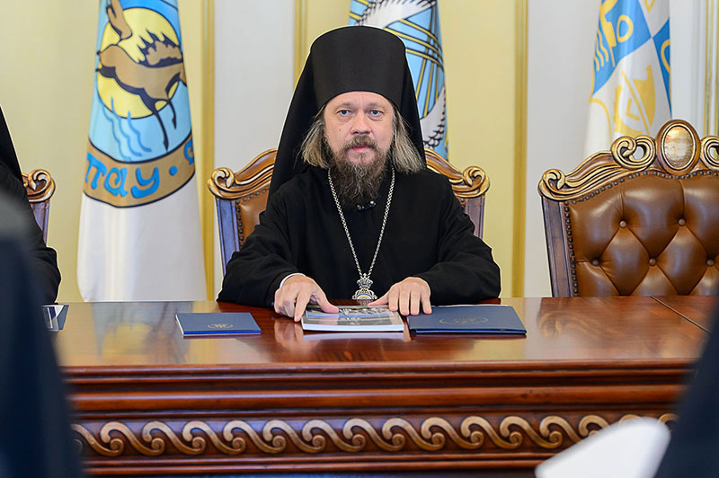 Епископ Геннадий представил информацию о встрече руководителей религиозных объединений Восточного Казахстана с акимом города Усть-Каменогорска О.М. Жаксылыком и общении ключаря Успенского кафедрального собора города Астаны протоиерея Димитрия Байдека со студентами факультета философии и религиоведения.