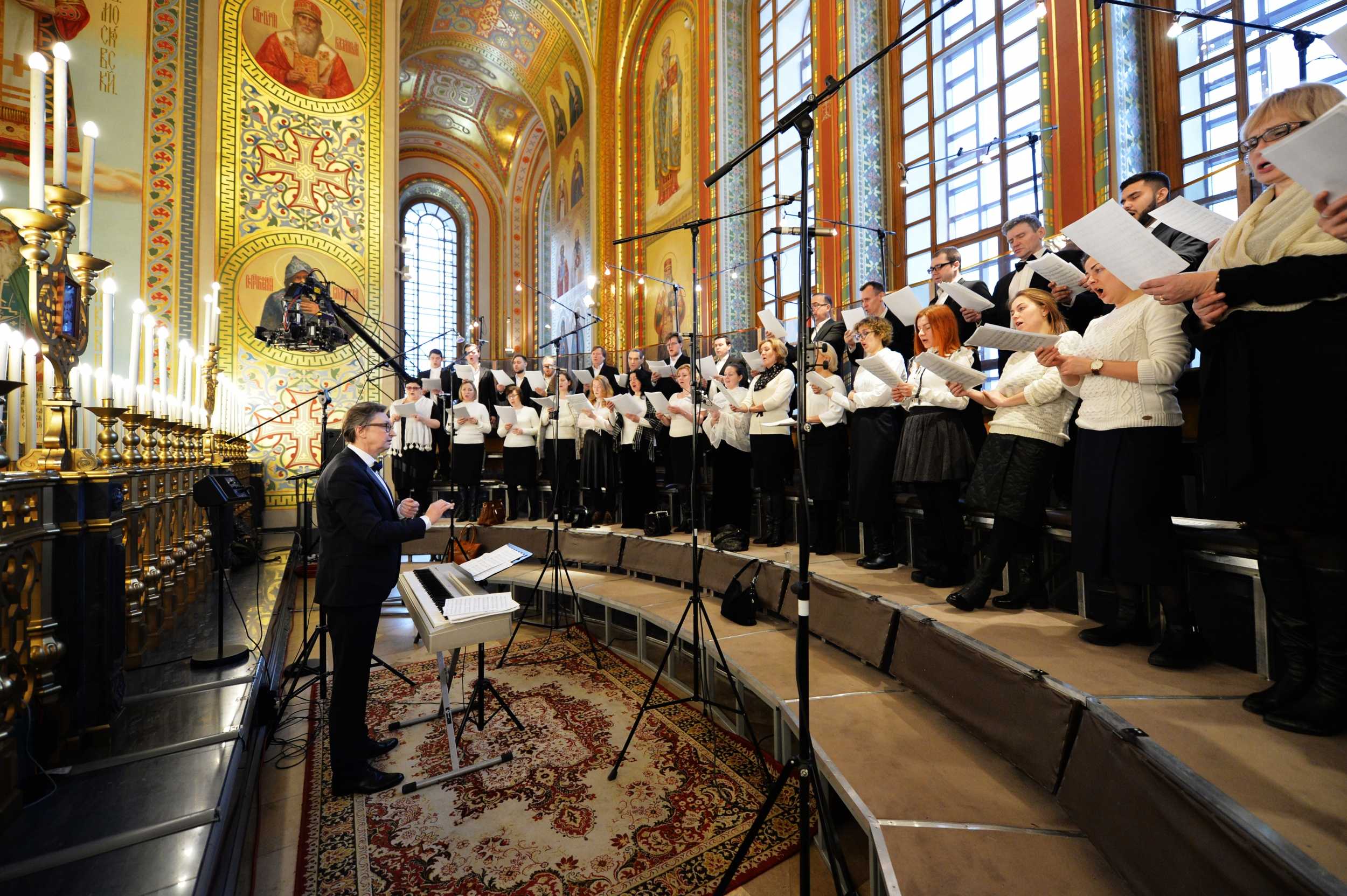 Богослужебные песнопения исполнили Патриарший хор Храма Христа Спасителя (регент И.Б. Толкачев) и братский хор Свято-Троицкой Сергиевой лавры (регент архимандрит Глеб (Кожевников)).