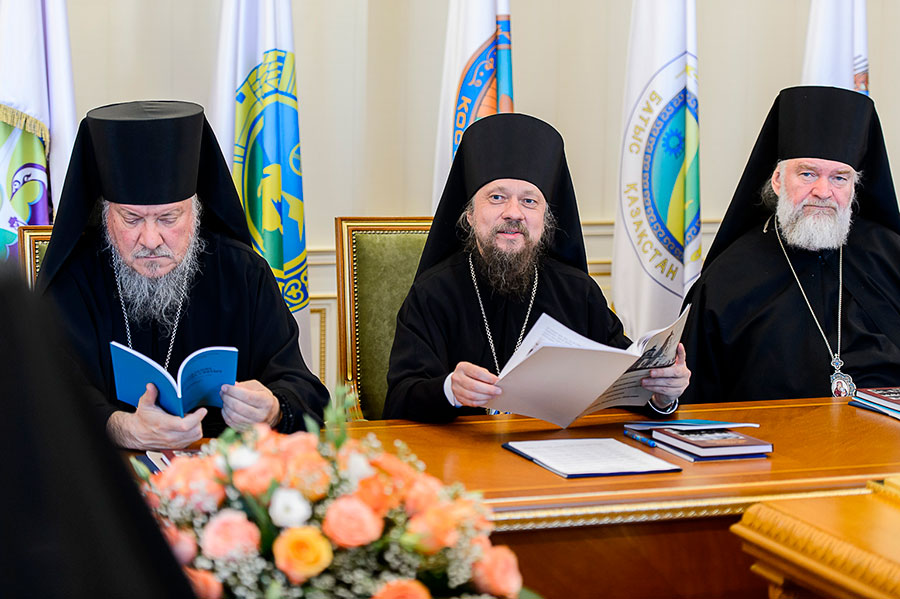 В составе Синода Казахстанского Митрополичьего округа: архиепископ Уральский и Актюбинский Антоний, архиепископ Чимкентский и Таразский Елевферий, епископ Костанайский и Рудненский Анатолий, викарий Астанайской епархии, епископ Талдыкорганский Нектарий, Управляющий делами Православной Церкви Казахстана епископ Каскеленский Геннадий, епископ Павлодарский и Экибастузский Варнава, епископ Карагандинский и Шахтинский Севастиан, епископ Усть-Каменогорский и Семипалатинский Амфилохий, епископ Кокшетауский и Акмолинский Серапион; епископ Петропавловский и Булаевский Владимир.
