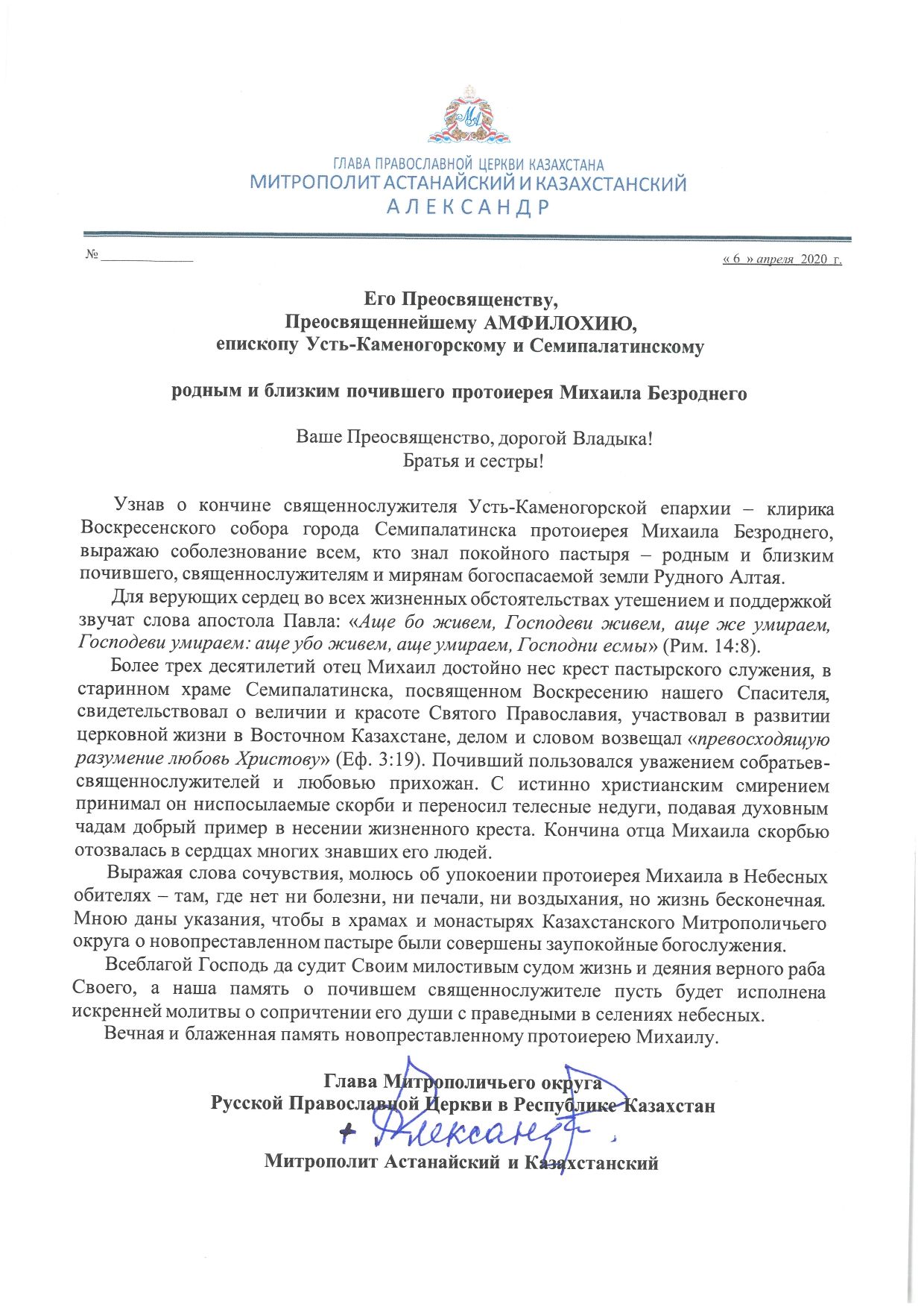 Соболезнование Главы Митрополичьего округа Русской Православной Церкви в Республике Казахстан митрополита Астанайского и Казахстанского Александра в связи с кончиной клирика Воскресенского Собора г.Семипалатинска протоиерея Михаила Безроднего