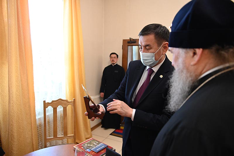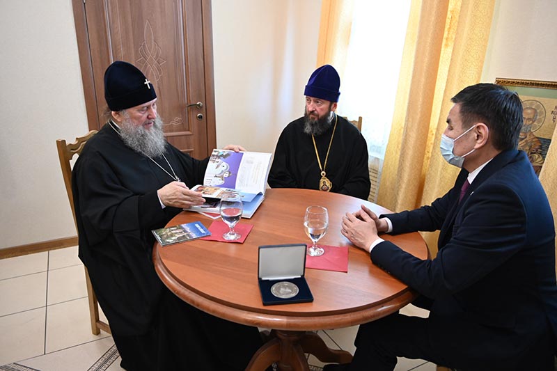 На память о встрече, которая прошла в дружеской атмосфере, митрополит Александр подарил акиму книгу «Храмы Казахстана. XXI век» и диски с записью митрополичьего хора под управлением Заслуженного деятеля искусств России О.Н. Овчинникова. Нурымбет Аманович преподнес иерарху памятные сувениры.