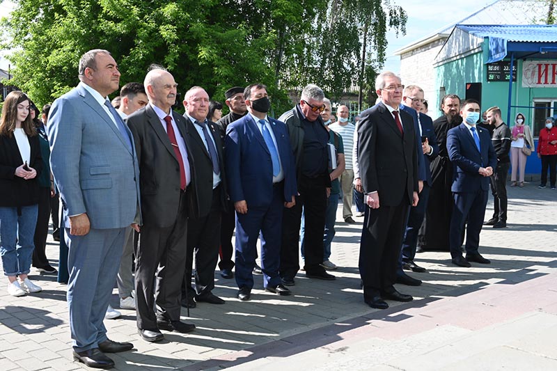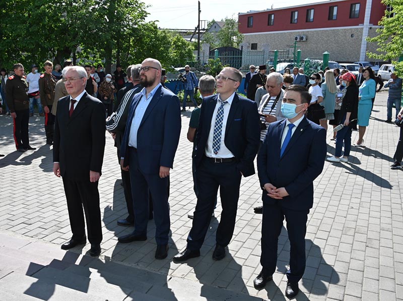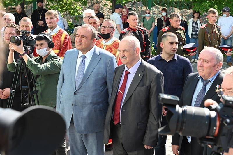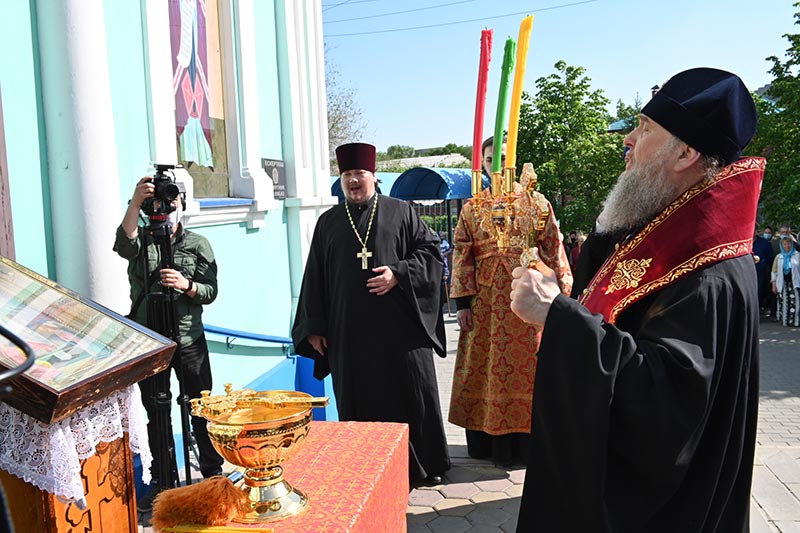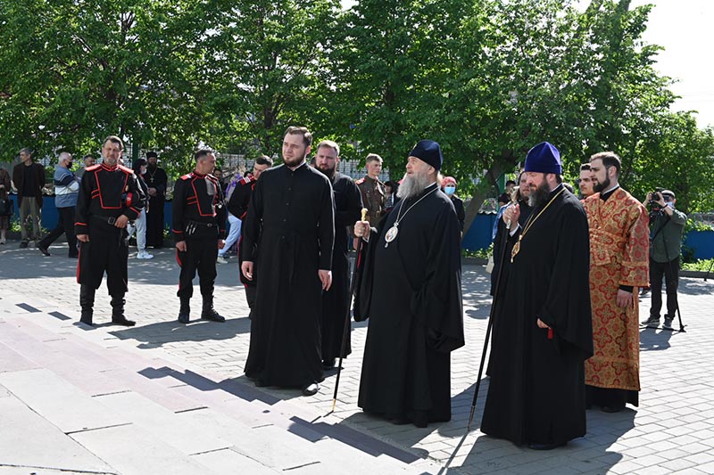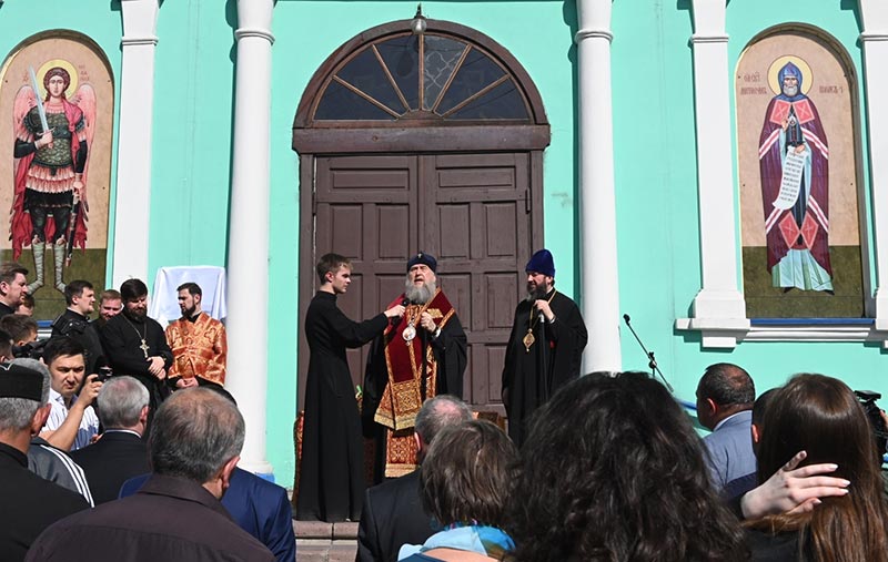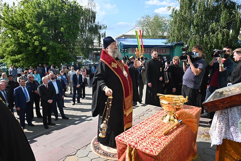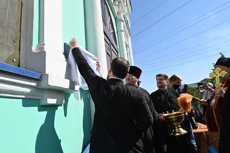 После слов приветствия при пении тропаря Светлому Христову Воскресению, священнослужители сняли с мемориального знака белый покров. Митрополит Александр огласил текст, запечатленный на памятной доске, и окропил ее святой водой.