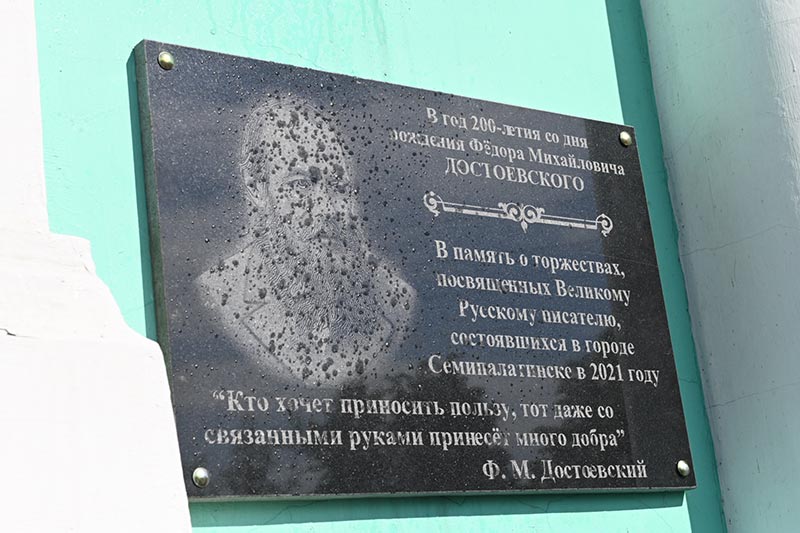 На доске выгравирован портрет Ф.М. Достоевского и запечатлен текст: «В год 200-летия со дня рождения Федора Михайловича Достоевского. В память о торжествах, посвященных великому русскому писателю, состоявшихся в городе Семипалатинске в 2021 году. «Кто хочет приносить пользу, тот даже со связанными руками принесет много добра» Ф.М. Достоевский».