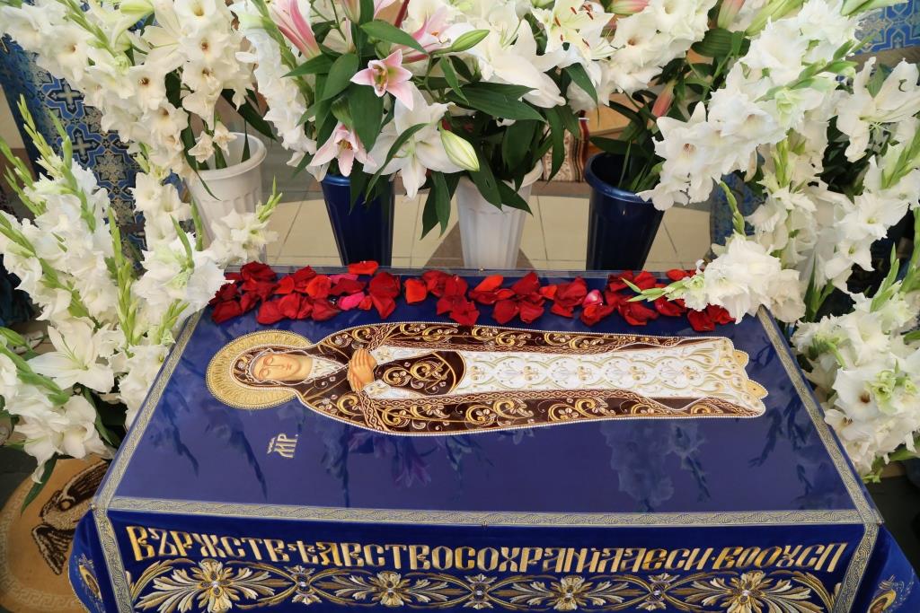 На утрене, во время пения праздничного тропаря, из алтаря на середину храма была изнесена плащаница с изображением Успения Божией Матери и положена на украшенную цветами гробницу. После прочтения евангельского зачала, Архипастырь помазал духовенство и прихожан освященным елеем.