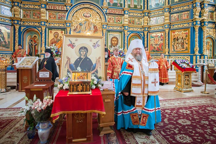 После Божественной Литургии в Успенском кафедральном соборе Астаны митрополит Астанайский и Казахстанский Александр совершил молебен перед ковчегом с Поясом Пресвятой Богородицы, доставленным в главный храм Казахстана накануне.