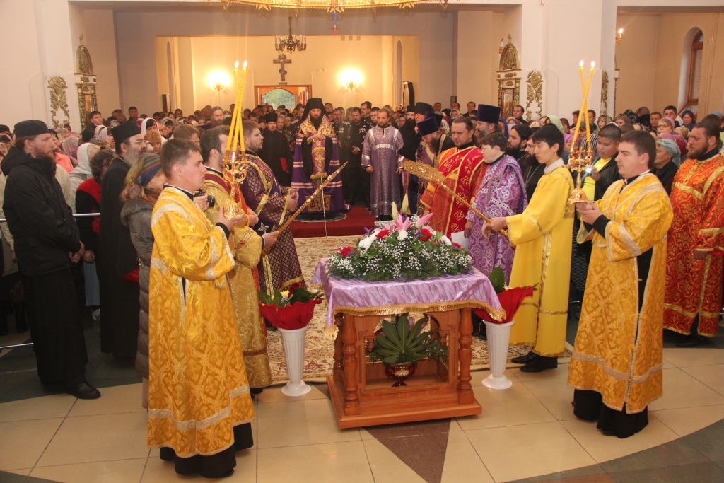 Продолжается пребывание в пределах Усть-Каменогорской епархии величайшей Святыни всего христианского мира – частицы Древа Животворящего Креста Господня. На следующий день после встречи Креста Христова Преосвященнейший епископ Усть-Каменогорский и Семипалатинский возглавил служение Божественной Литургии в Свято-Андреевском кафедральном соборе города Усть-Каменогорск. Архипастырю сослужил сонм епархиального духовенства.