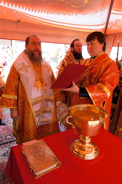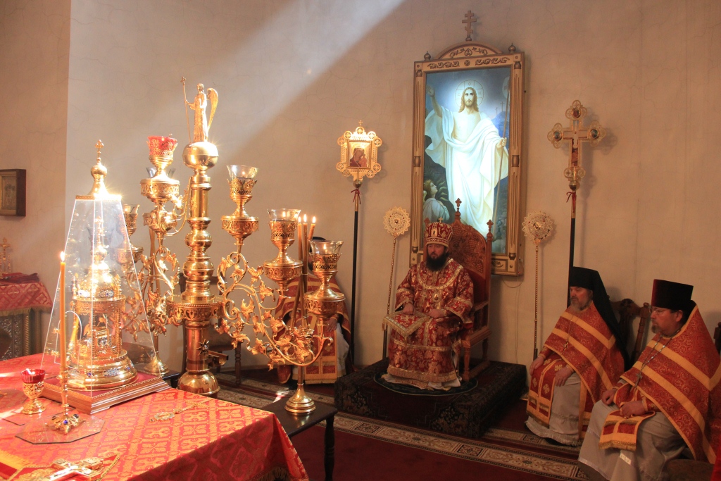 Его Преосвященству сослужили: благочинный Семипалатинского церковного округа, настоятель Воскресенского собора г.Семипалатинска митрофорный протоиерей Федор Проскурин, клирик Знаменско-Петропавловского семипалатинского женского монастыря игумен Аникита (Макаров), ключарь Андреевского кафедрального собора г.Усть-Каменогорска иерей Иоанн Карабидович, настоятель храма в честь Успения Божией Матери с.Канонерка иерей Петр Хонин, настоятель Пророко-Ильинского храма с.Урджар иерей Александр Меринов, клирики Воскресенского собора г.Семипалатинска: протоиерей Михаил Безродний, иерей Алексий Конопацкий, диакон Андрей Дудник и диакон Евгений Хохряков.