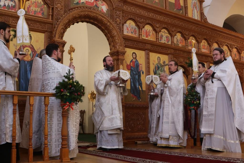 За рождественским богослужением молились сотрудники епархиального управления, насельники Свято-Троицкой обители, многочисленные прихожане. Праздничные песнопения исполнял хор Андреевского собора под управлением Н. Романцовой.