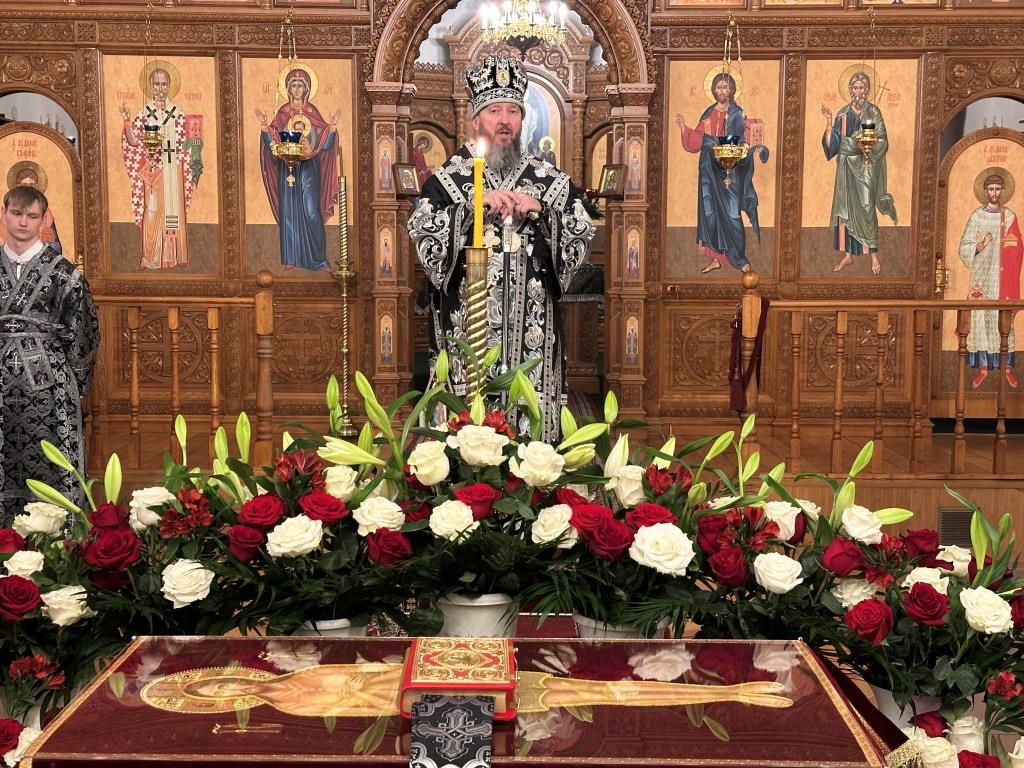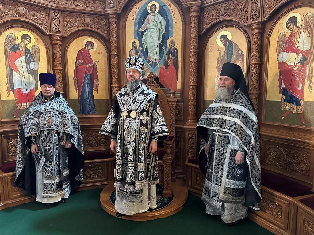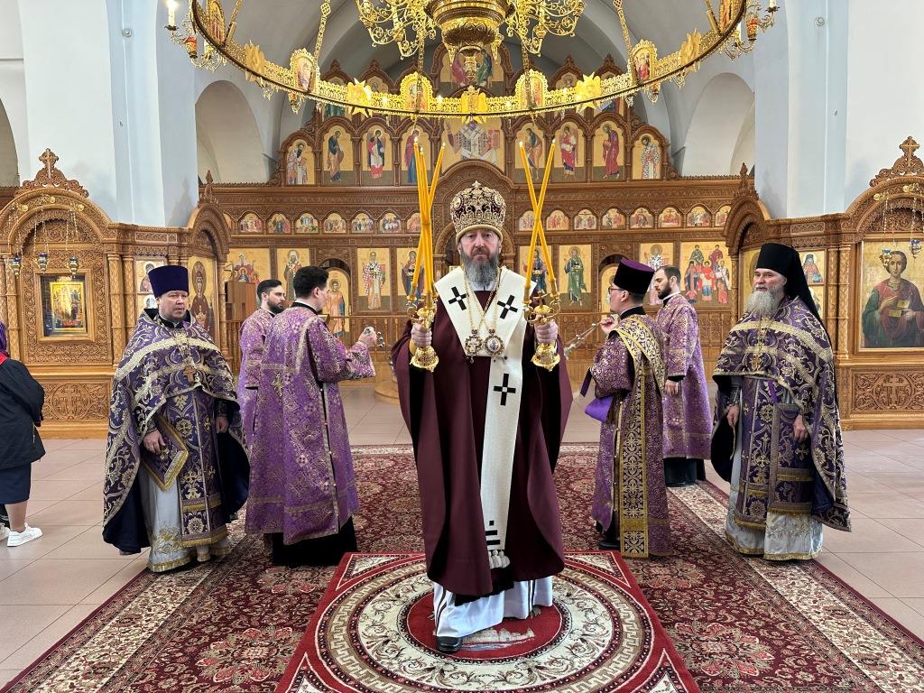 Его Высокопреосвященству сослужили ключарь кафедрального собора иеромонах Никодим (Авдеев), клирик собора иерей Роман Подрезов, протодиакон Андрей Дудник, секретарь епархии диакон Илия Кван, диакон Кирилл Рамазанов.