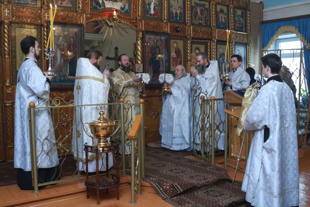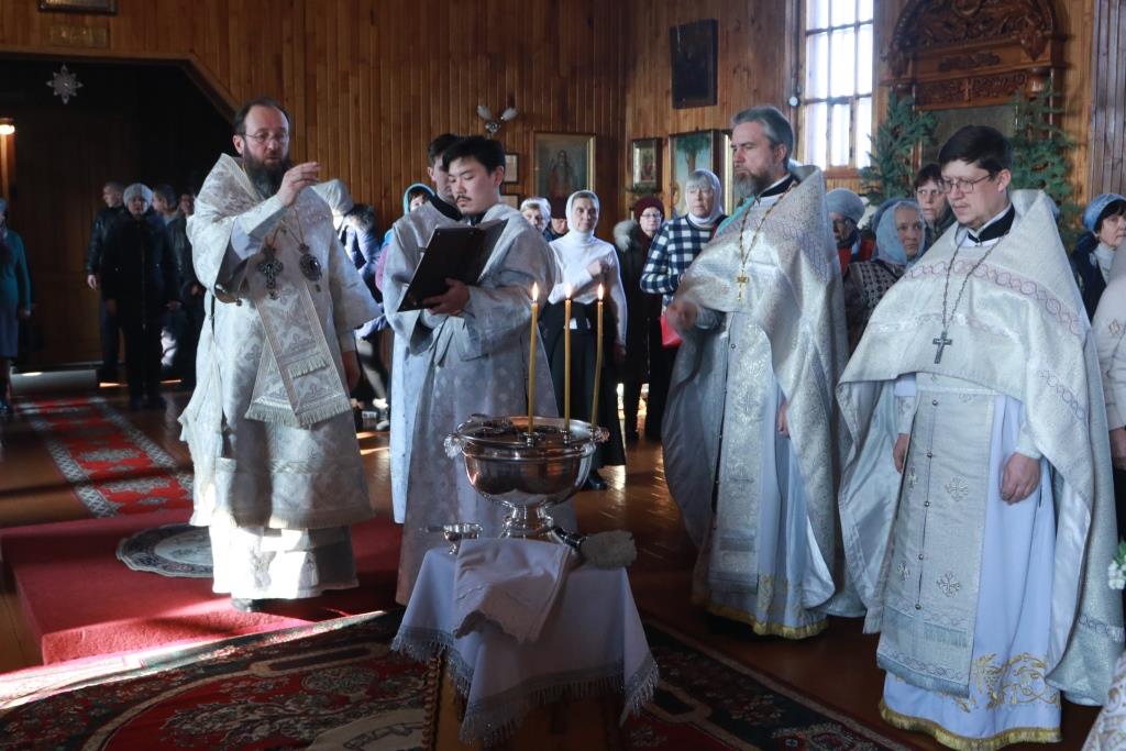 Его Преосвященству сослужили: духовник Усть-Каменогорской епархии архимандрит Спиридон (Теплухин), благочинный Усть-Каменогорского церковного округа настоятель Покровского храма иерей Алексий Анищенко, ключарь Андреевского кафедрального собора иеромонах Никодим (Авдеев), клирик Покровской церкви иерей Роман Подрезов, секретарь епархии диакон Илия Кван, протодиакон Андрей Дудник, диакон Александр Якушев.