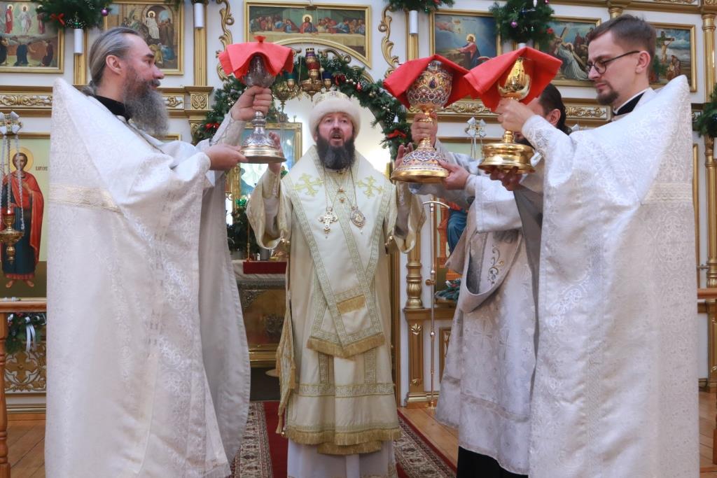 Празднование Рождества Христова в главном храме Рудного Алтая началось со служения Всенощного бдения, которое состояло из Великого повечерия, литии и утрени. В праздничную ночь епископ Усть-Каменогорский и Семипалатинский Амфилохий возглавил служение Божественной Литургии святителя Василия Великого.