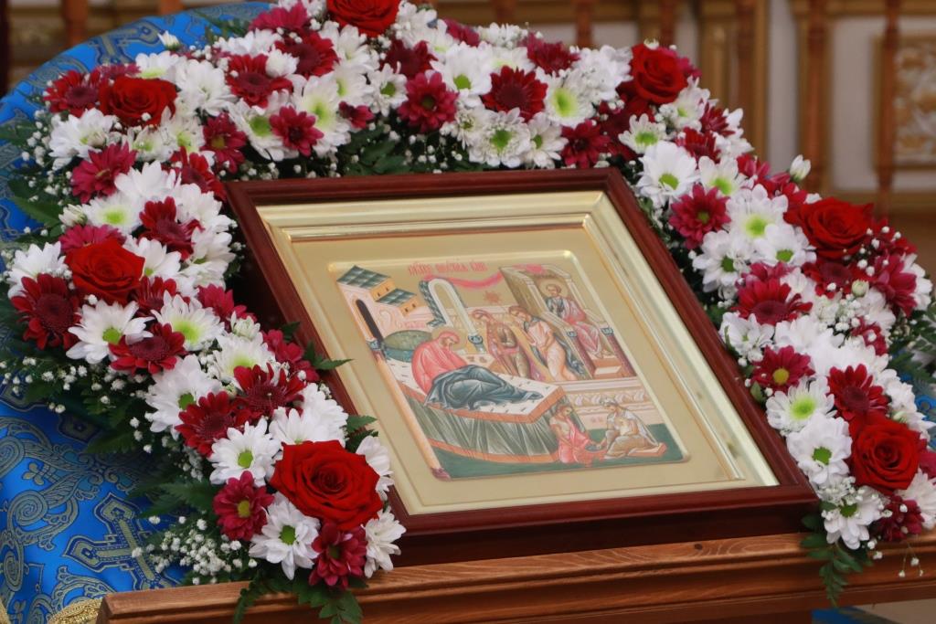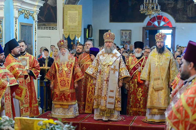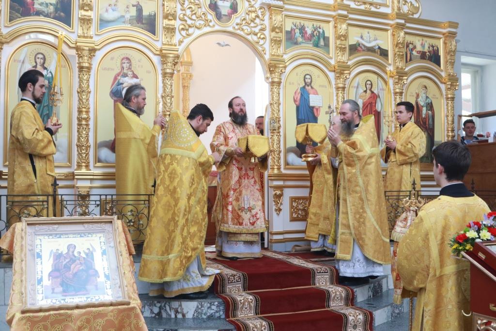 За богослужением великого освящения и Божественной Литургией Предстоятелю Православной Церкви Казахстана сослужили: викарий Астанайской епархии епископ Талдыкорганский Нектарий, епископ Усть-Каменогорский и Семипалатинский Амфилохий; настоятель храма в честь иконы Пресвятой Богородицы «Всех скорбящих радость» протоиерей Евгений Воробьев, благочинный Талдыкорганского церковного округа иеромонах Клавдиан (Поляков), ключарь Петропавловского храма Алма-Аты протоиерей Кирилл Шкляр, ключарь храма Веры, Надежды, Любови и Софии – Представительства Митрополичьего округа в Москве – иерей Сергий Неретин, помощник Главы Митрополичьего округа иерей Георгий Сидоров, духовенство Талдыкорганского благочиния, диаконский чин возглавил клирик Вознесенского кафедрального собора города Алма-Аты протодиакон Николай Гринкевич.