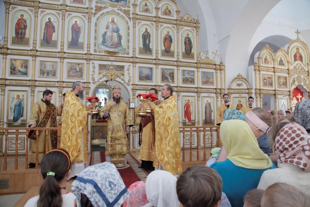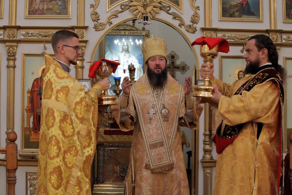 Его Преосвященству сослужили: духовник епархии архимандрит Спиридон (Теплухин), ключарь собора иеромонах Никодим (Авдеев), клирики собора иеромонах Севастиан (Андрющенко) и иерей Константин Дьяков; протодиакон Андрей Дудник, иеродиакон Мефодий (Шевчук), диакон Алексий Горбунов, диакон Владимир Лаврешин. За праздничным Богослужением совершалась лития – сугубое моление с освящением хлебов, пшеницы, вина и елея.
