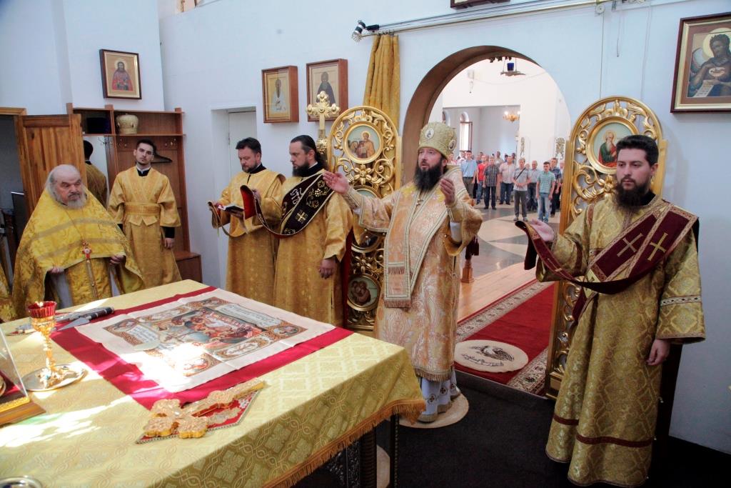 Преосвященнейшему Архипастырю сослужили: духовник епархии архимандрит Спиридон (Теплухин), ключарь собора иеромонах Никодим (Авдеев), протодиакон Андрей Дудник, иеродиакон Мефодий (Шевчук).