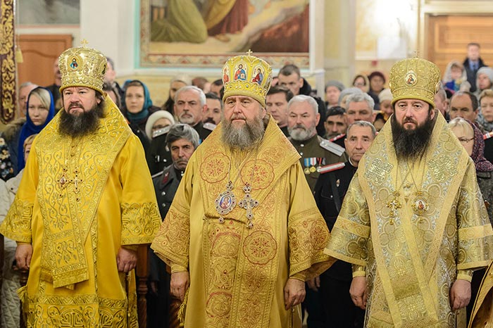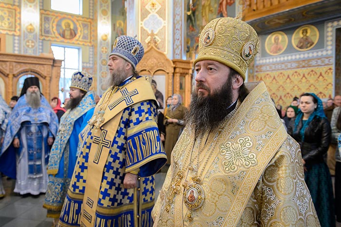 Его Преосвященству сослужили: благочинный Усть-Каменогорского церковного округа иерей Алексий Анищенко, настоятель храма в честь Казанской иконы Божией Матери посёлка Усть-Таловка протоиерей Роман Сычук, настоятель Трёхсвятительского храма посёлка Глубокое иерей Константин Акентьев, протодиакон Андрей Дудник.