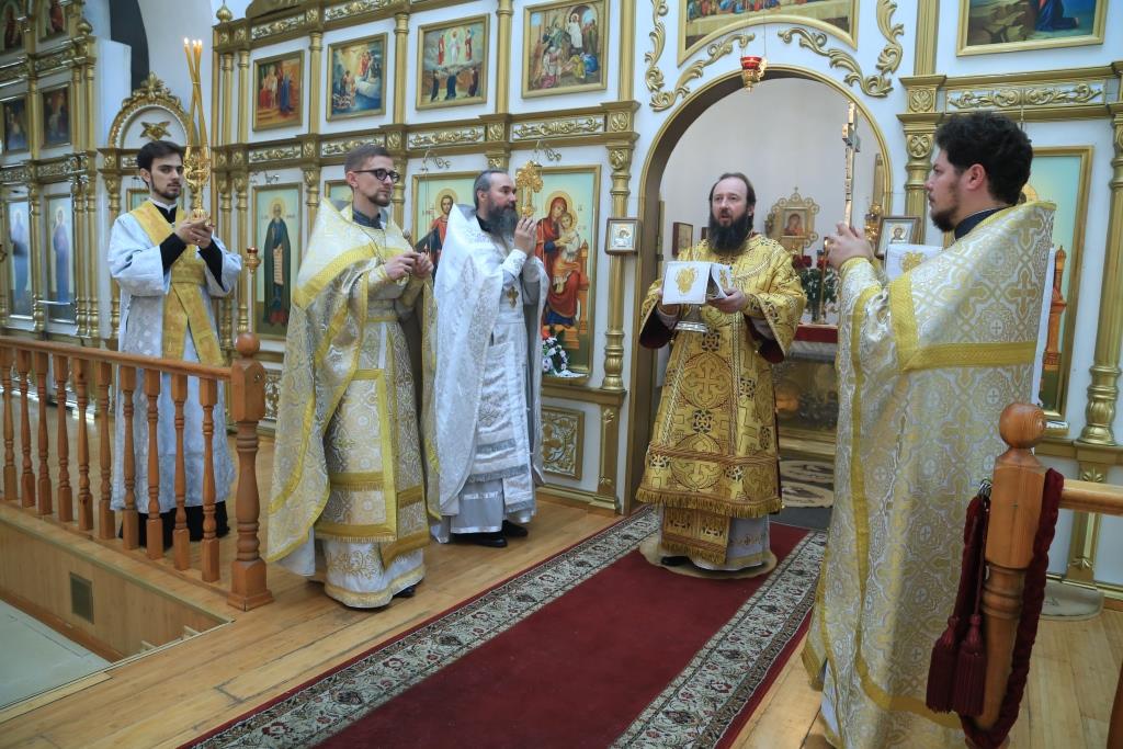 Управляющий Усть-Каменогорской и Семипалатинской епархией Преосвященнейший епископ Амфилохий возглавил служение Божественной Литургии святителя Иоанна Златоуста в кафедральном соборе во имя апостола Андрея Первозванного города Усть-Каменогорска. Владыке епископу сослужили: духовник епархии архимандрит Спиридон (Теплухин), ключарь кафедрального собора иеромонах Никодим (Авдеев), протодиакон Георгий Засыпкин, иеродиакон Мефодий (Шевчук), иеродиакон Тимофей (Хитрич).