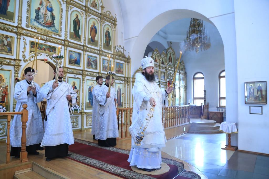 В воскресный день Управляющий Усть-Каменогорской и Семипалатинской епархией Преосвященнейший епископ Амфилохий возглавил служение Божественной Литургии святителя Иоанна Златоуста в кафедральном соборе в честь апостола Андрея Первозванного города Усть-Каменогорска.