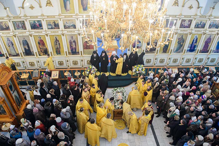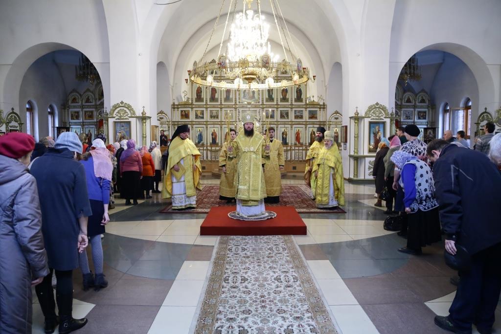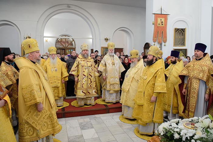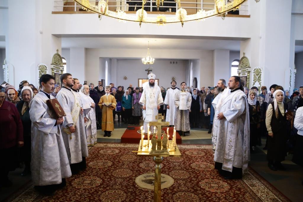 Архипастырю сослужили: духовник епархии архимандрит Спиридон (Теплухин), клирик Покровского храма города иеромонах Иустин (Ларионов), ключарь собор иеромонах Никодим (Авдеев), клирик храма иерей Константин Дьяков; протодиакон Андрей Дудник, диакон Георгий Сухобокий.