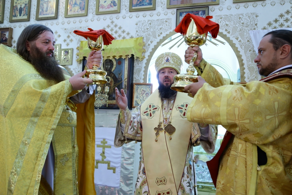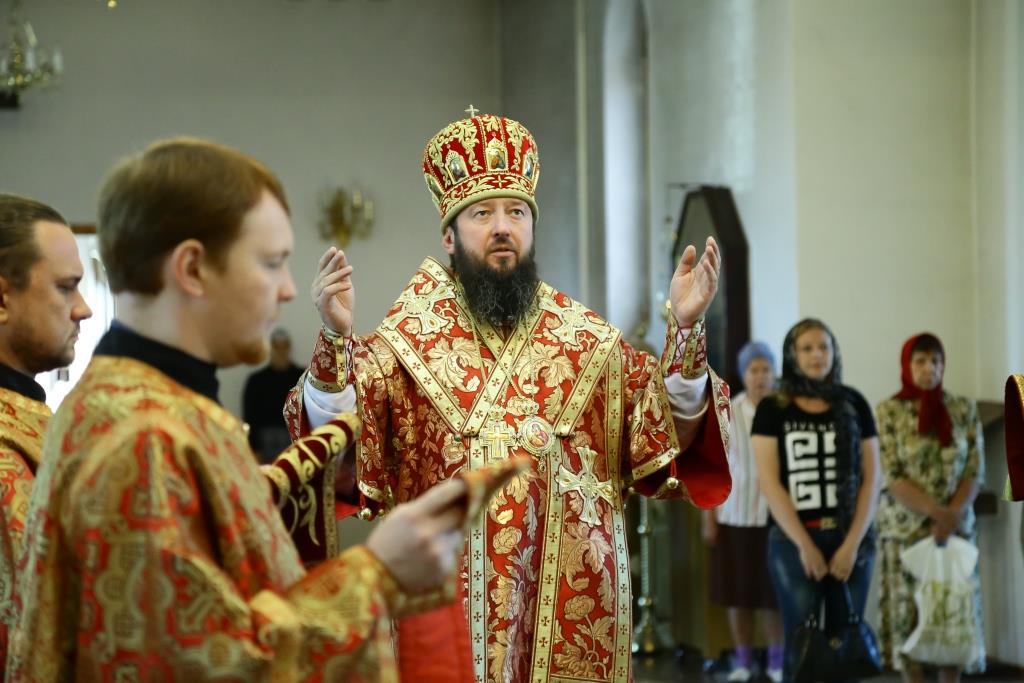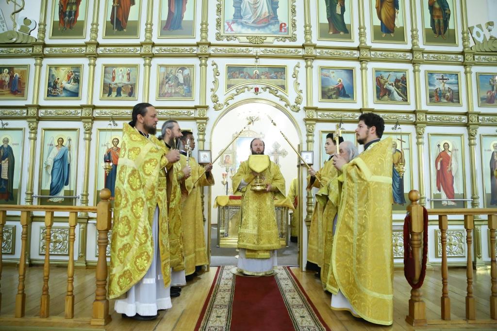 Его Преосвященству сослужили: духовник епархии архимандрит Спиридон (Теплухин), ключарь собора иеромонах Никодим (Авдеев); диаконский чин возглавил протодиакон Андрей Дудник.