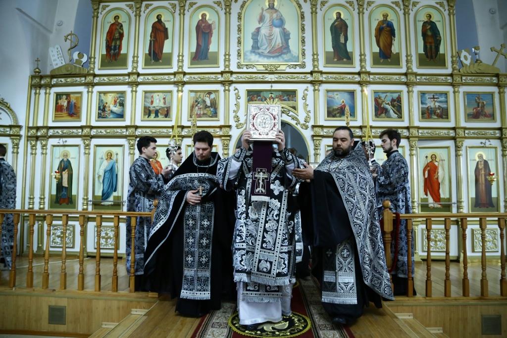 В начале утрени, под пение тропаря «Егда славнии ученицы», священнослужители изнесли из алтаря святое Евангелие и возложили на аналое перед Крестом, установленным посредине храма.