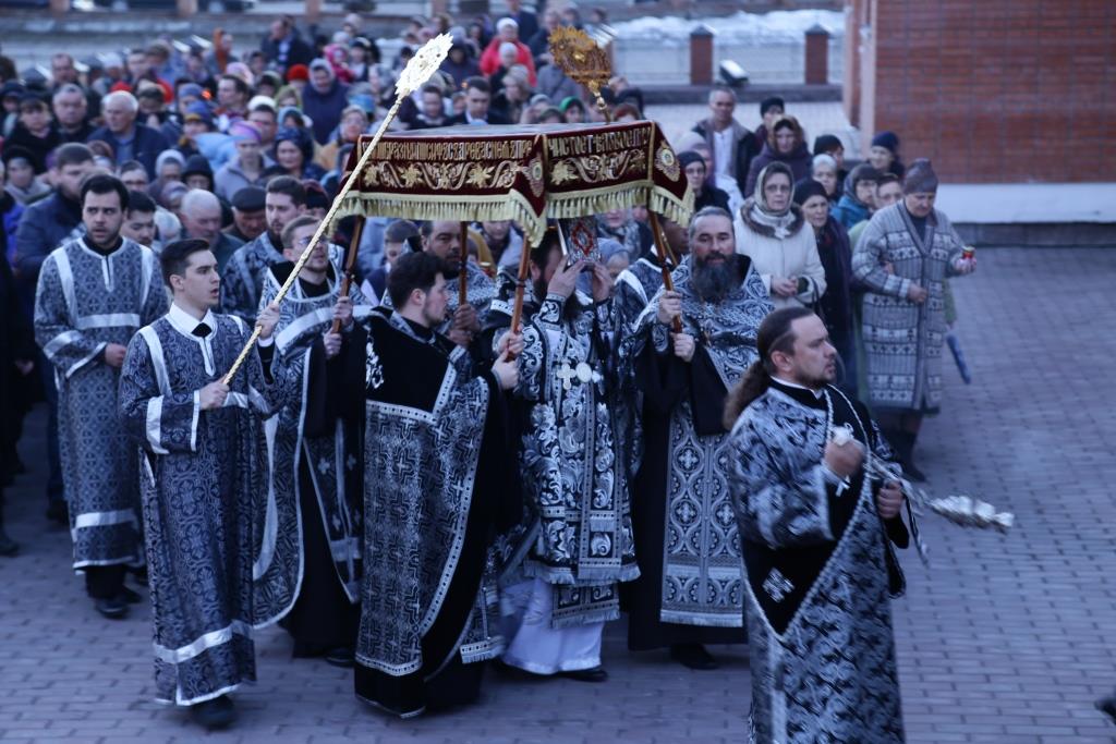 По окончании великого славословия с пением погребального «Святый Боже» Плащаница была обнесена вокруг храма крестным ходом.