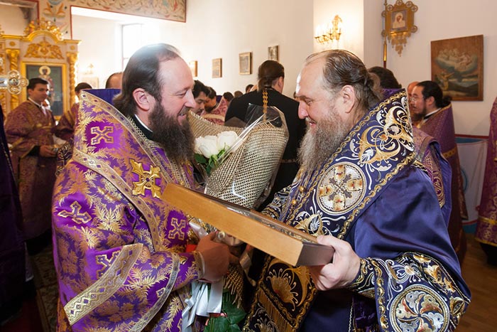Управляющему епархией сослужили: духовник Усть-Каменогорской епархии архимандрит Спиридон (Теплухин), ключарь Андреевского собора иеромонах Никодим (Авдеев), секретарь Управляющего Усть-Каменогорской епархией иеромонах Силуан (Магилёв), заведующий Епархиальной канцелярией иерей Константин Дьяков, иерей Георгий Гуцалов; протодиакон Георгий Засыпкин; клирики собора протодиакон Андрей Дудник, иеродиакон Мефодий (Шевчук) и диакон Георгий Сухобокий.