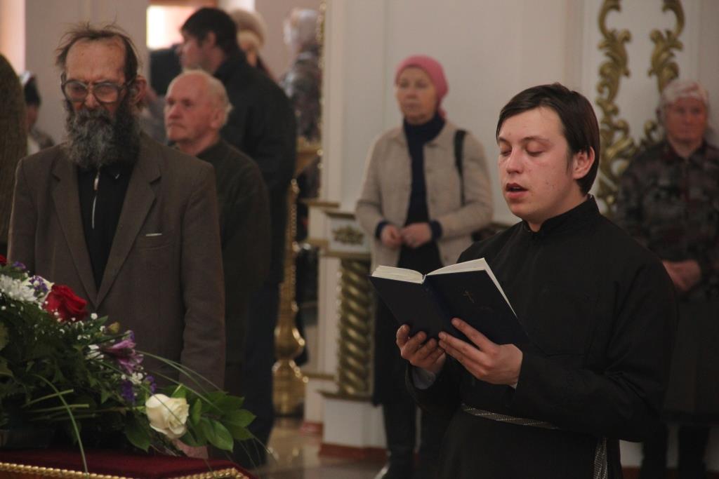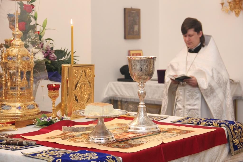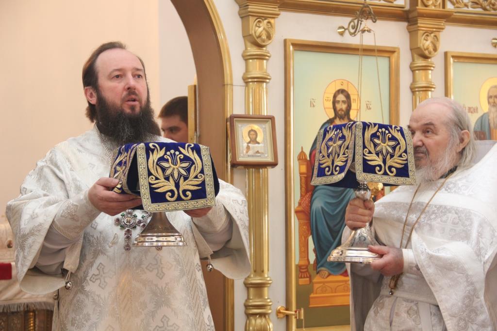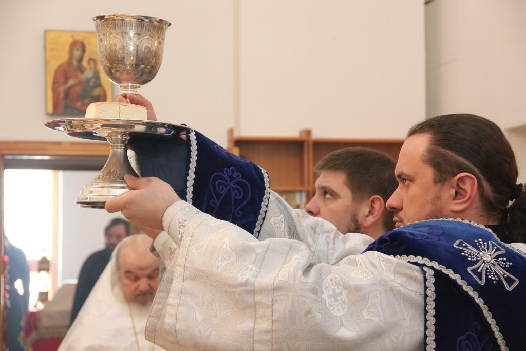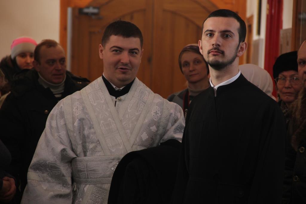 За Божественной Литургией, перед причастием мирян проповедовал священник Константин Дьяков. После заамвонной молитвы Епископ Амфилохий с клириками воспел славление празднику Сретения Господня.