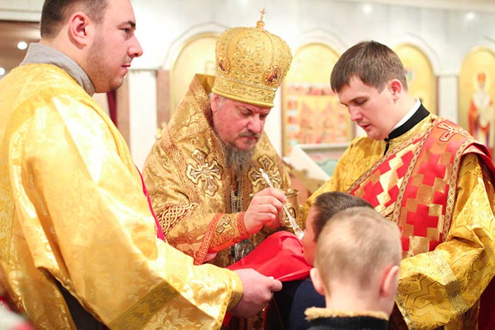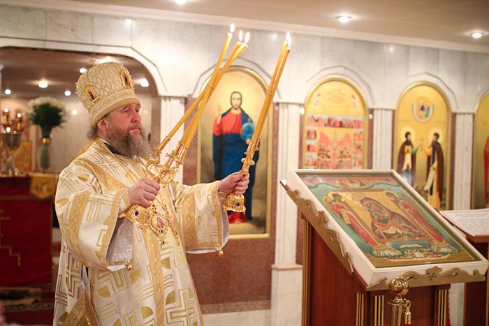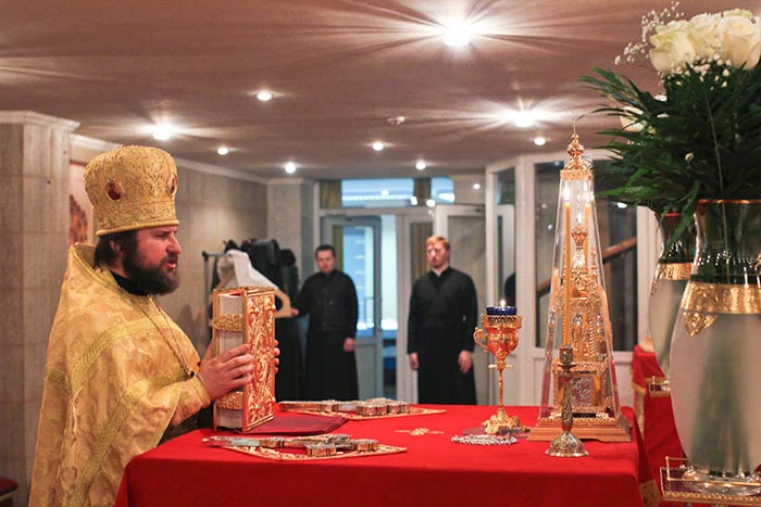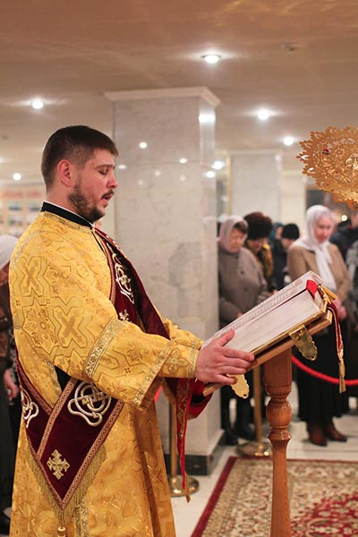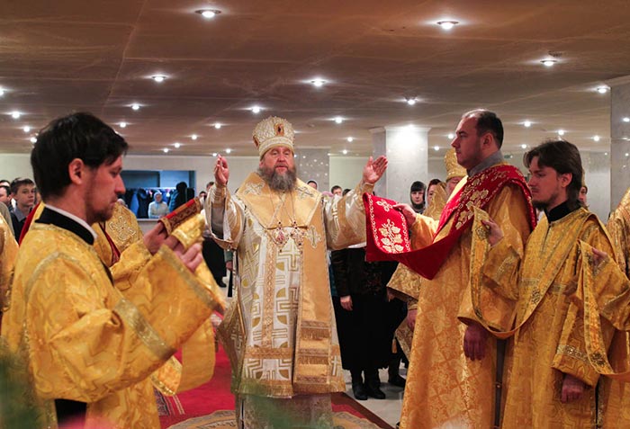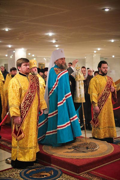 По запричастном стихе было оглашено Обращение Святейшего Патриарха Кирилла к полноте Русской Православной Церкви в связи с событиями на Украине. Усердная молитва о прекращении братоубийственной смуты на Украинской земле совершалась в этот день во всех храмах и обителях Казахстанского Митрополичьего Округа.
