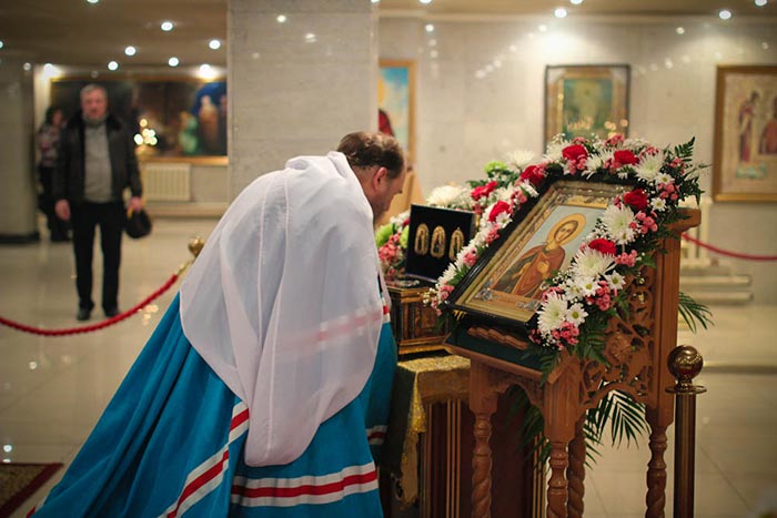 Во время богослужения на аналое в центре храме пребывали икона мученика Вонифатия и ковчег с частью его мощей, доставленные в Казахстан по благословению Предстоятеля Русской Православной Церкви.