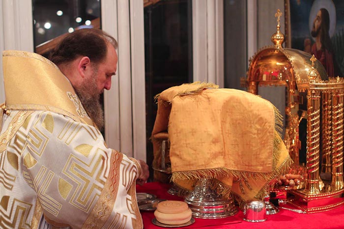В завершение Литургии перед иконой мученика Вонифатия и ковчегом с частью его мощей было совершено славление.