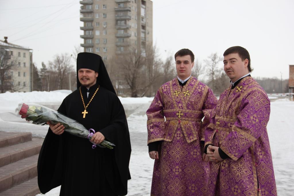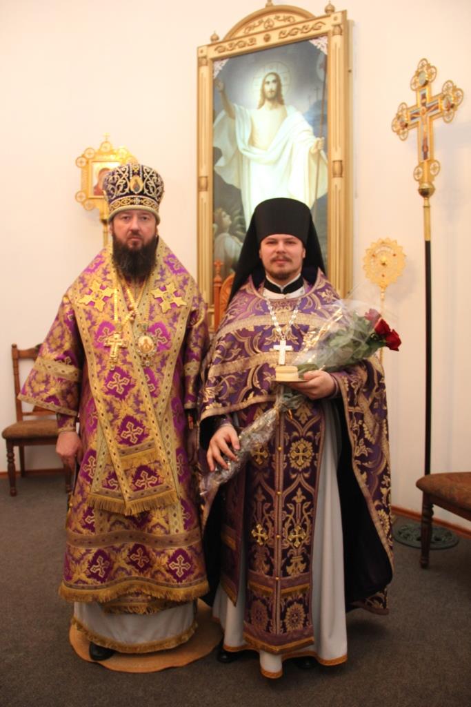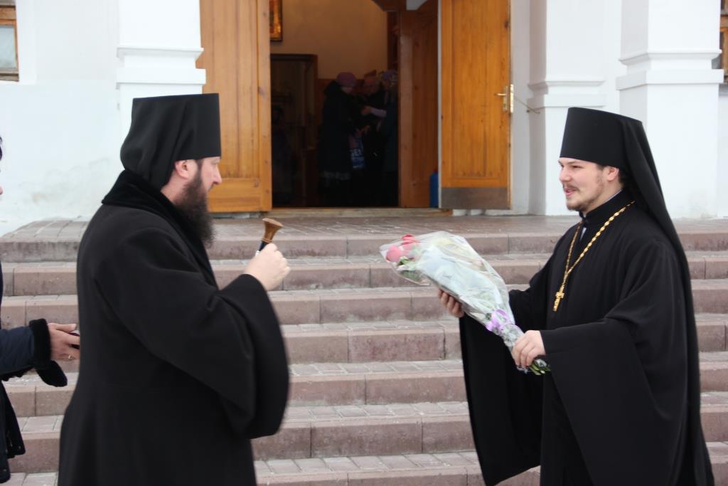 За богослужением Владыка Амфилохий поздравил с днем рождения личного секретаря, клирика кафедрального собора иеромонаха Силуана, который в этот день празднует свое 25-летие, и преподнес ему в дар наперсный крест и святую просфору.
