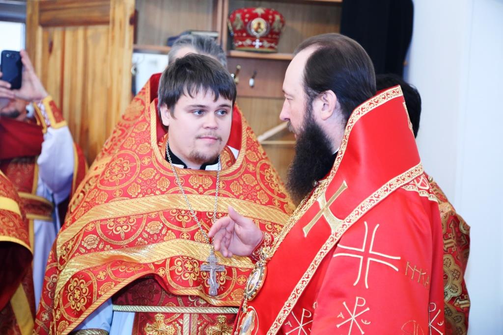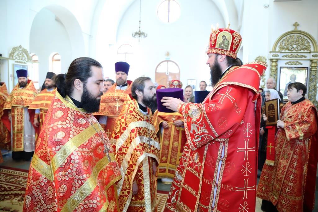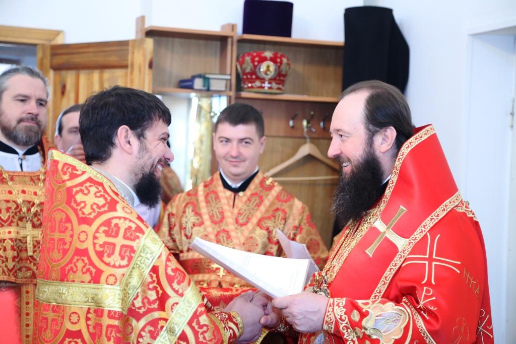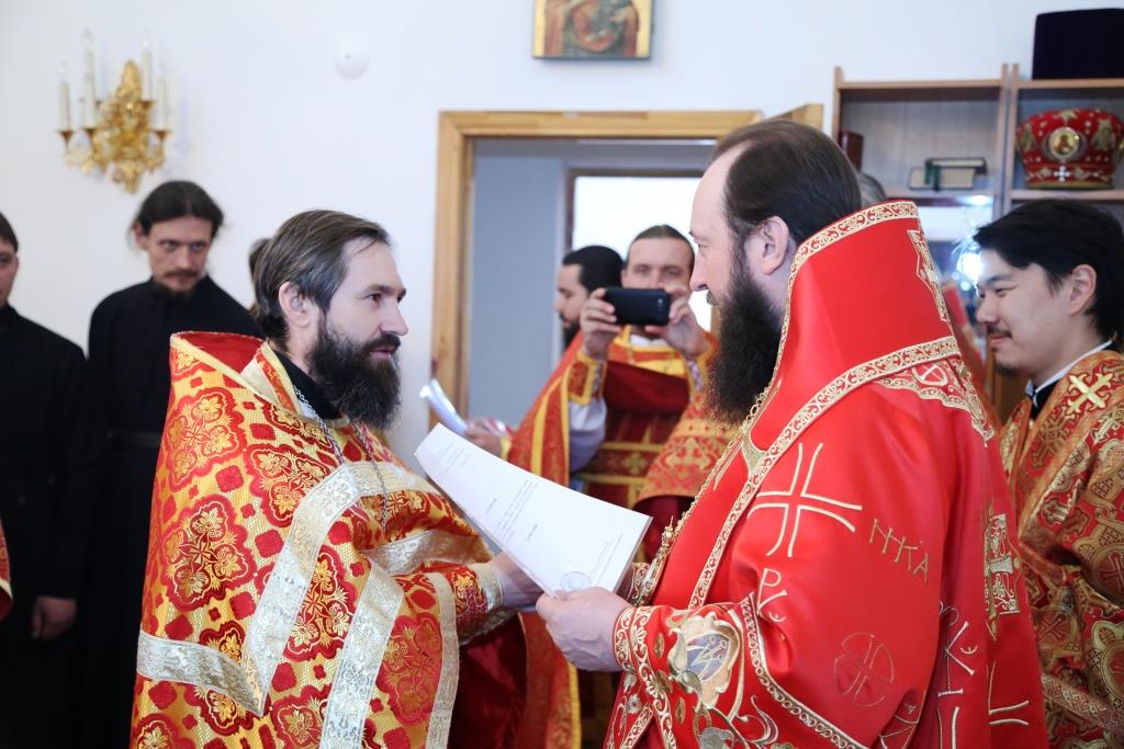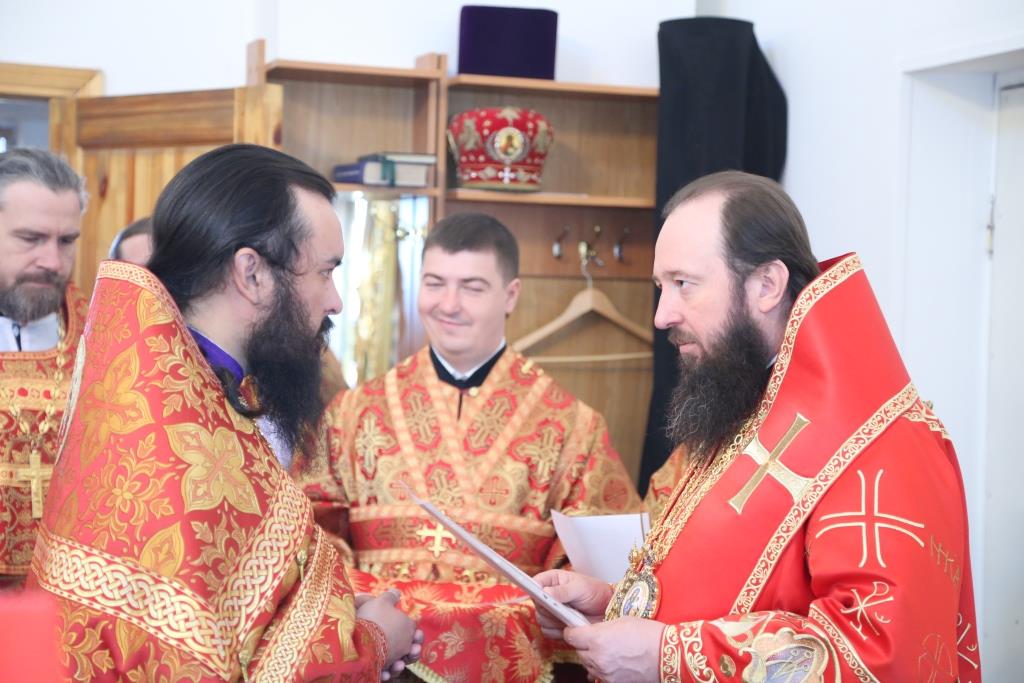На малом входе Божественной Литургии ряд клириков епархии был удостоен богослужебно-иерархических наград. По благословению Святейшего Патриарха Московского и всея Руси Кирилла, епископ Амфилохий возвел в сан протоиерея настоятеля Свято-Покровского храма поселка Самарское иерея Николая Темирбаева и настоятеля Пророко-Илиинского храма города Серебрянска иерея Сергия Семченко. Настоятель Пророко-Илиинского храма поселка Урджар иерей Александр Меринов был награжден правом ношения наперсного креста. Настоятель Свято-Стефаниевского храма села Предгороное иерей Михаил Арабов и клирик Свято-Андреевского кафедрального собора иерей Андрей Лебединский были удостоены права ношения камилавки.