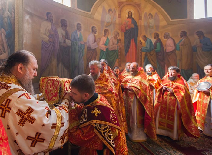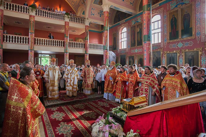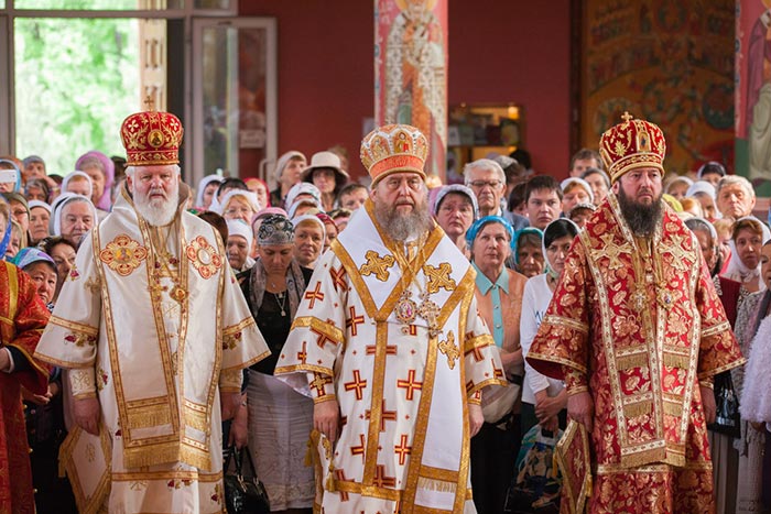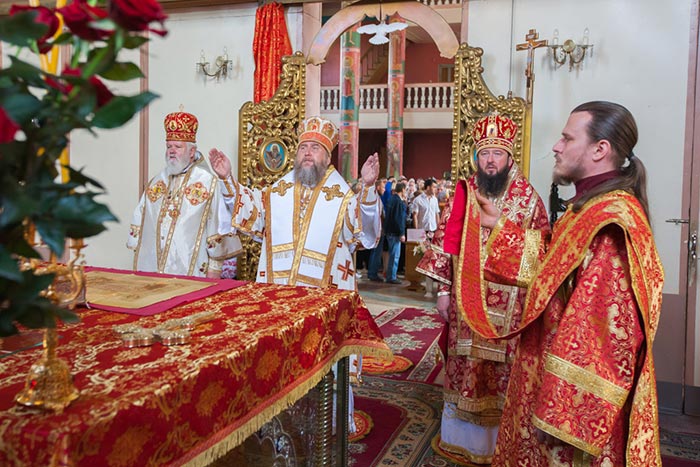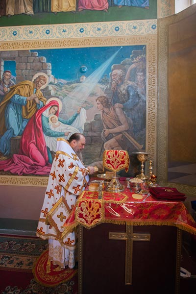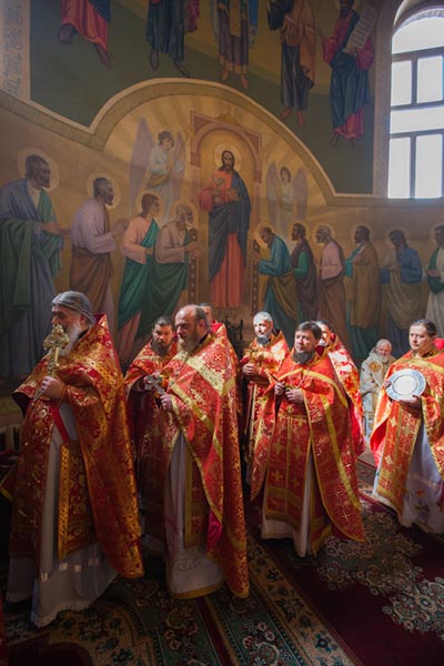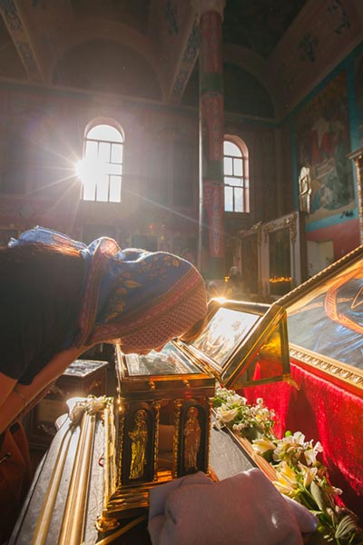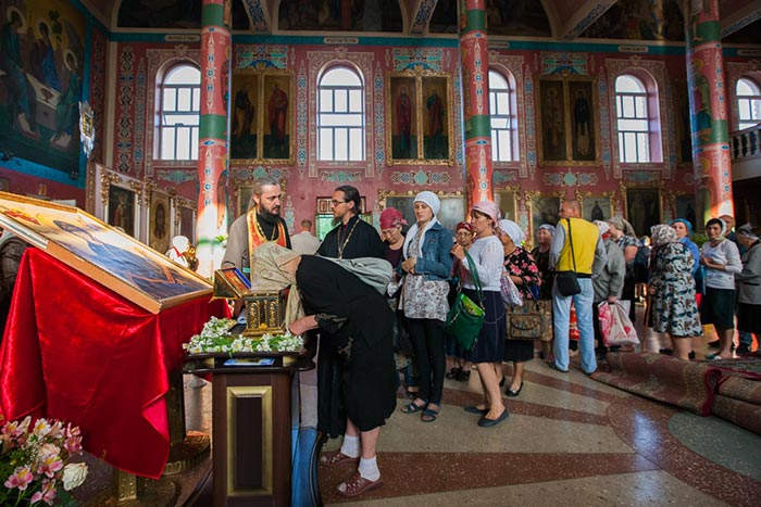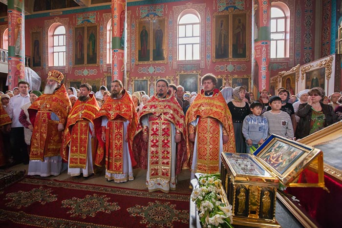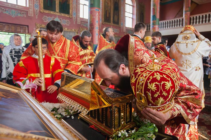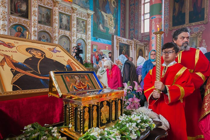 К началу Литургии в Успенский храм была принесена еще одна святыня – ковчег с мощами святителя и чудотворца Николая, архиепископа Мирликийского, доставленный из алма-атинского Свято-Никольского собора.