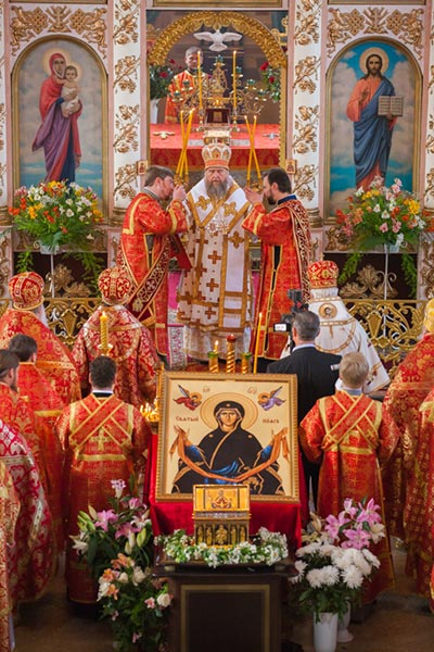 На протяжение всей ночи перед святыней служились каноны; тысячи паломников прибыли испросить благословения и помощи Царицы Небесной.