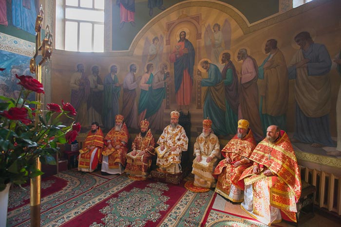 Высокопреосвященнейшему Александру сослужили: архиепископ Чимкентский и Таразский Елевферий; епископ Усть-Каменогорский и Семипалатинский Амфилохий; настоятель храма в честь иконы Божией Матери «Всех скорбящих радость» города Алма-Аты протоиерей Евгений Воробьев; руководитель Издательского отдела Казахстанского Митрополичьего округа архимандрит Иосиф (Еременко); руководитель Информационного отдела Митрополичьего округа протоиерей Евгений Иванов; настоятель Успенского собора города протоиерей Георгий Власенко, настоятель Покровского храма протоиерей Димитрий Сташенко; руководитель службы протокола митрополита протодиакон Роман Головин; протодиакон Свято-Никольского собора Южной столицы Георгий Засыпкин; духовенство Чимкентской епархии.
