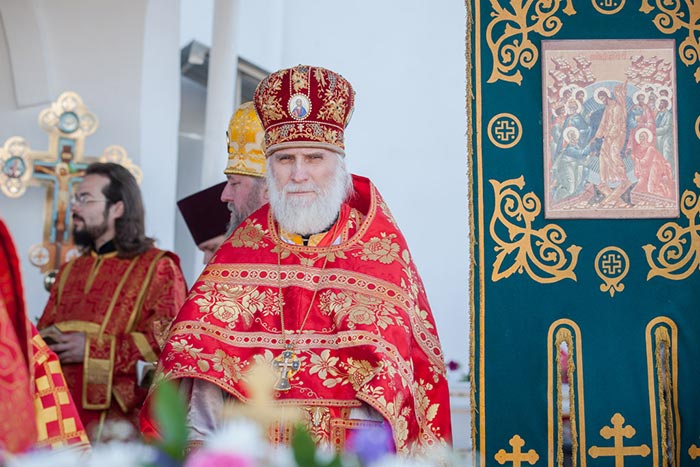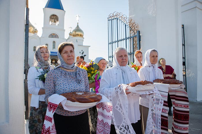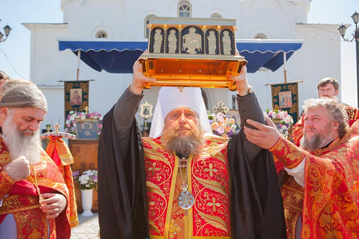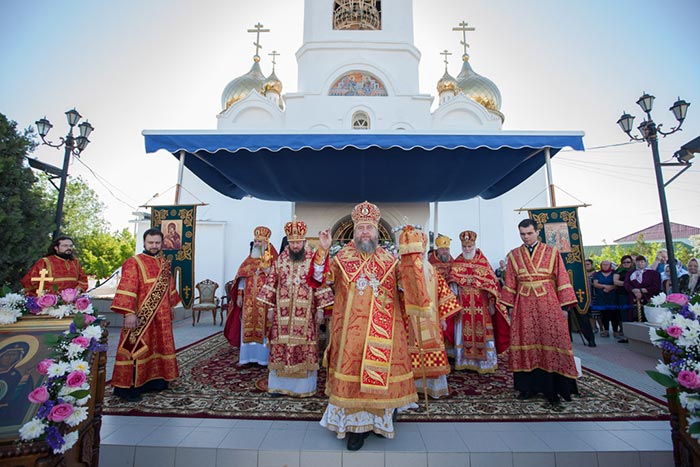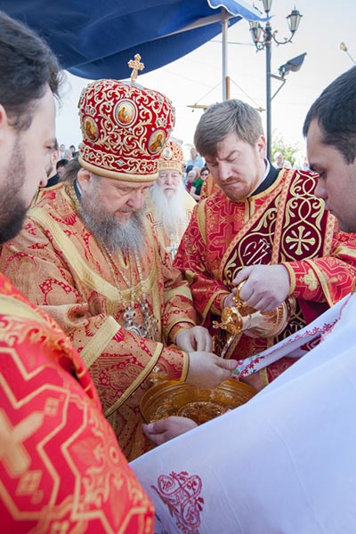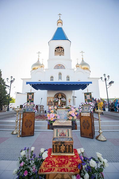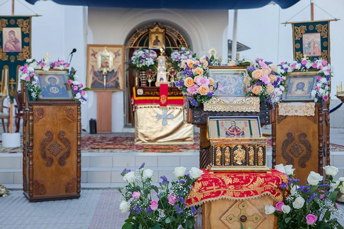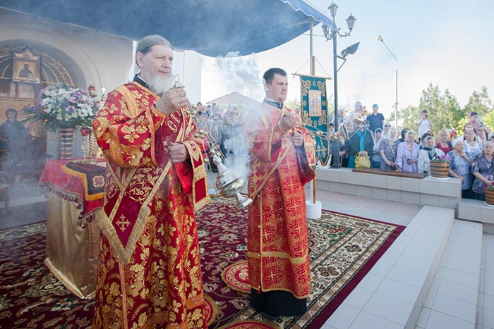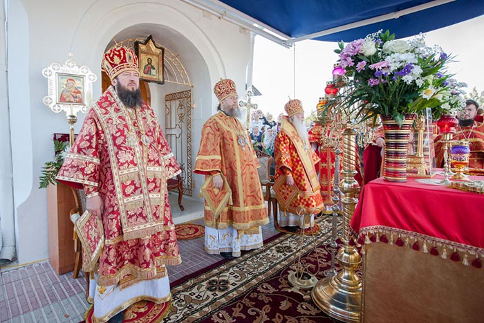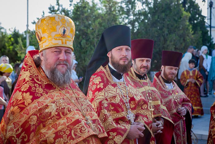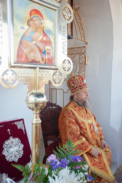 Из-за большого стечения верующих Литургия совершалась под открытым небом на площади перед храмом. Здесь же был установлен ковчег с Поясом Пресвятой Богородицы, доставленный в Благовещенскую церковь накануне вечером.