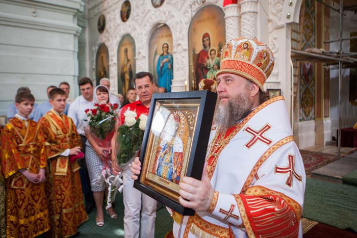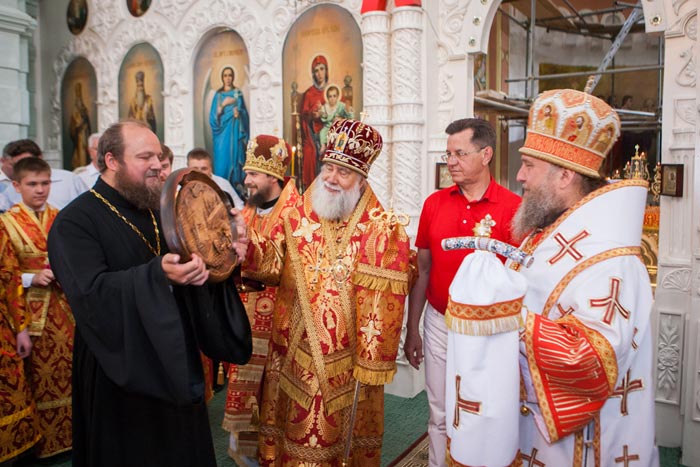 В подарок митрополиту Александру глава Астраханской митрополии преподнес резной Деисис – образ Спаса Вседержителя с Предстоящими - Пресвятой Богородицей и Предтечей Иоанном.